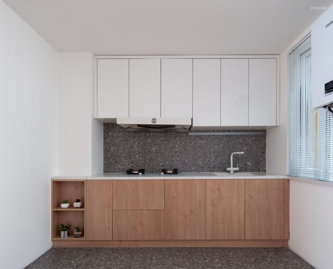 1、将原厨房隔墙拆除,打造开放式厨房,引入自然光,解决了厨房狭小采光的问题。