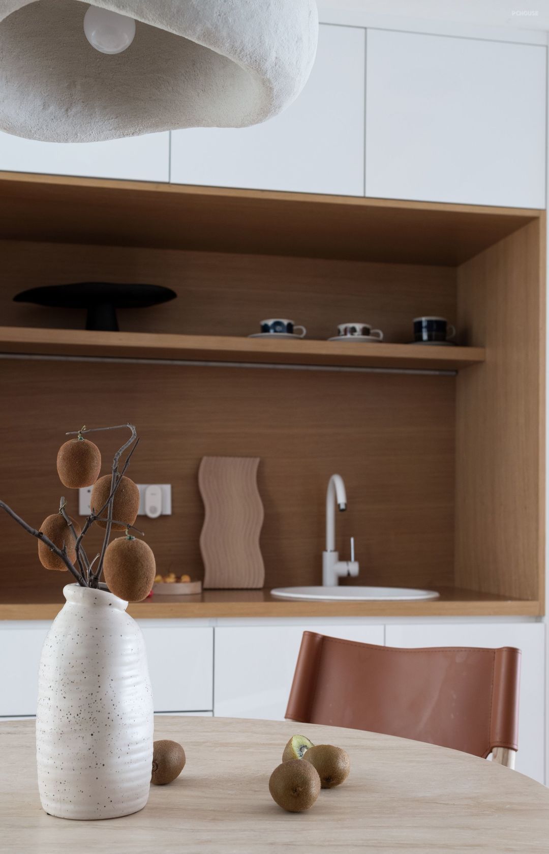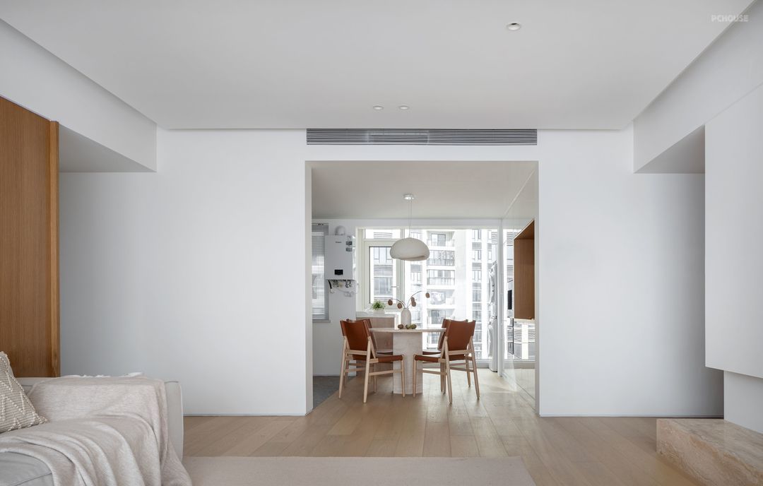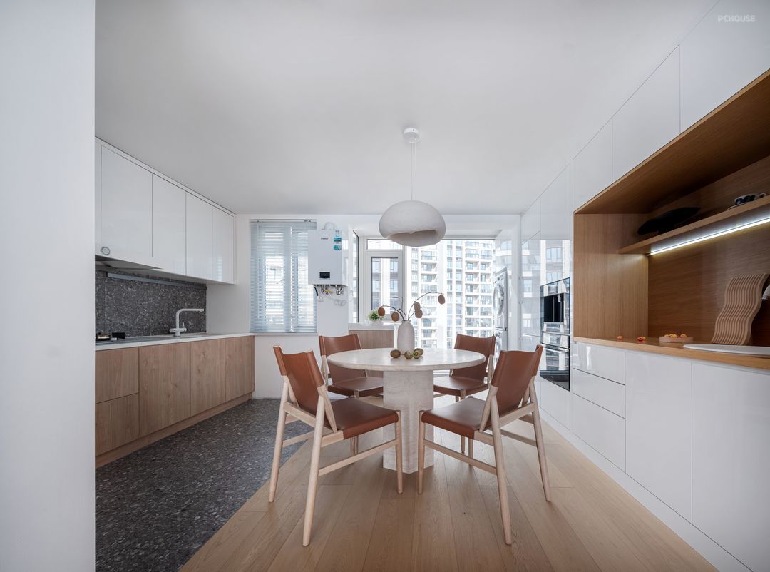 连通客厅,餐厨空间规划成一体化开放式格局。前面说到原户型格局厨房空间封闭狭小,采光和通风都不好,所以最终确定的方案是餐厨一体,沿袭着原木与纯白的色调搭配温暖无比,采用了开放式包围性的空间设计,确保采光通透,也增加了和家人的互动。