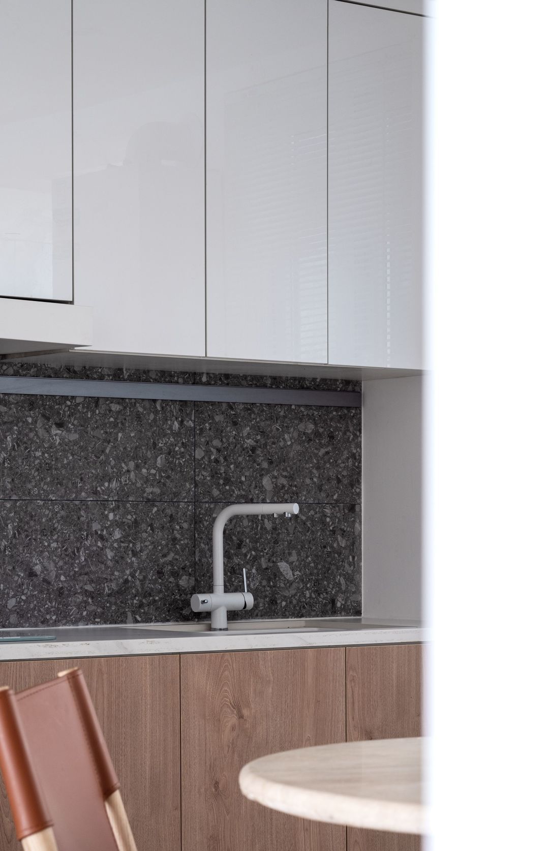 虽然是开放式厨房,但屋主还是有每天在家里烹饪的生活习惯,所以中厨的整体设计还是较为传统,一字型的台面把整个厨房的流程都规划清楚。用石材做台面,耐脏也比较好清理。