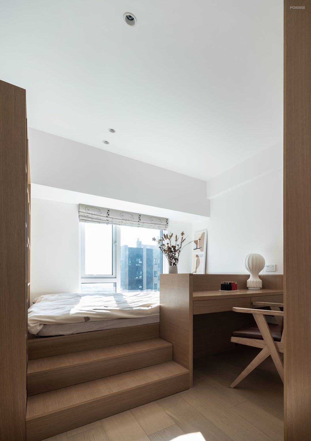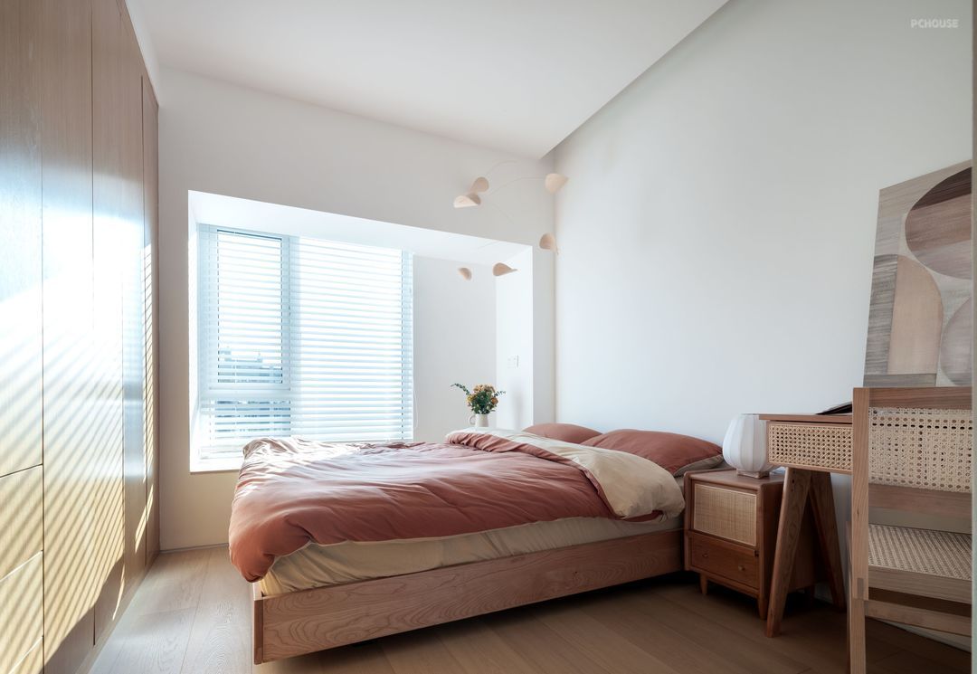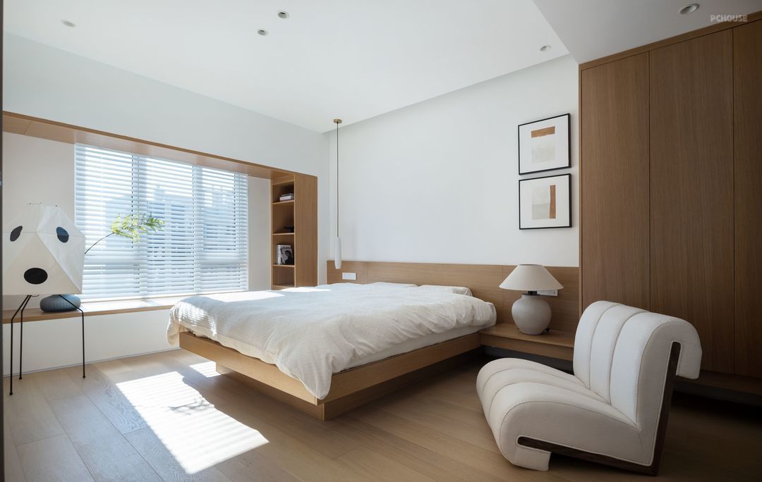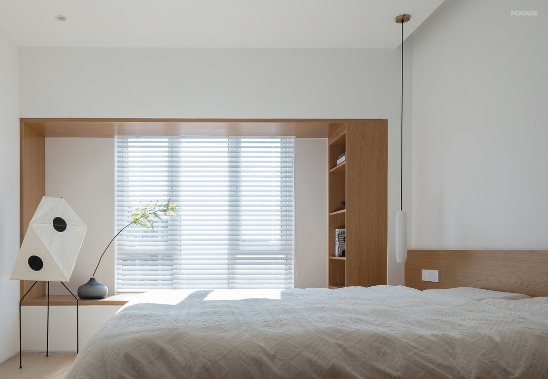 主卧设计以简为美,不事奢华,是淡雅安静的模样。延续外部空间的设计元素,大大的飘窗,干净的白色百叶帘,让光线成为整个卧室最不缺的元素,木色与白色在自然光的牵引下,呈现出柔美的氛围感。