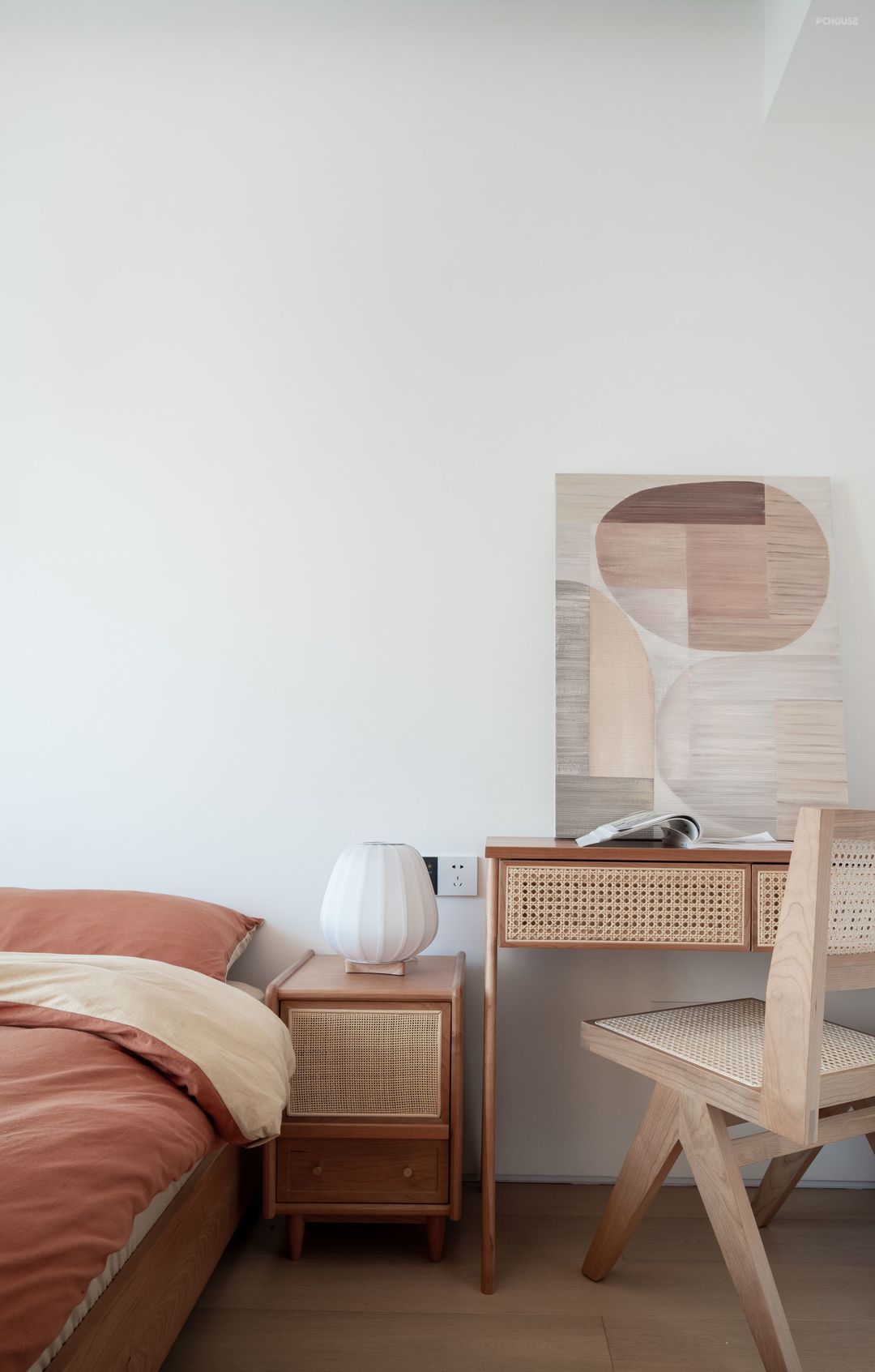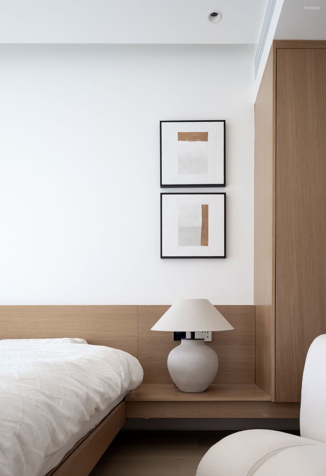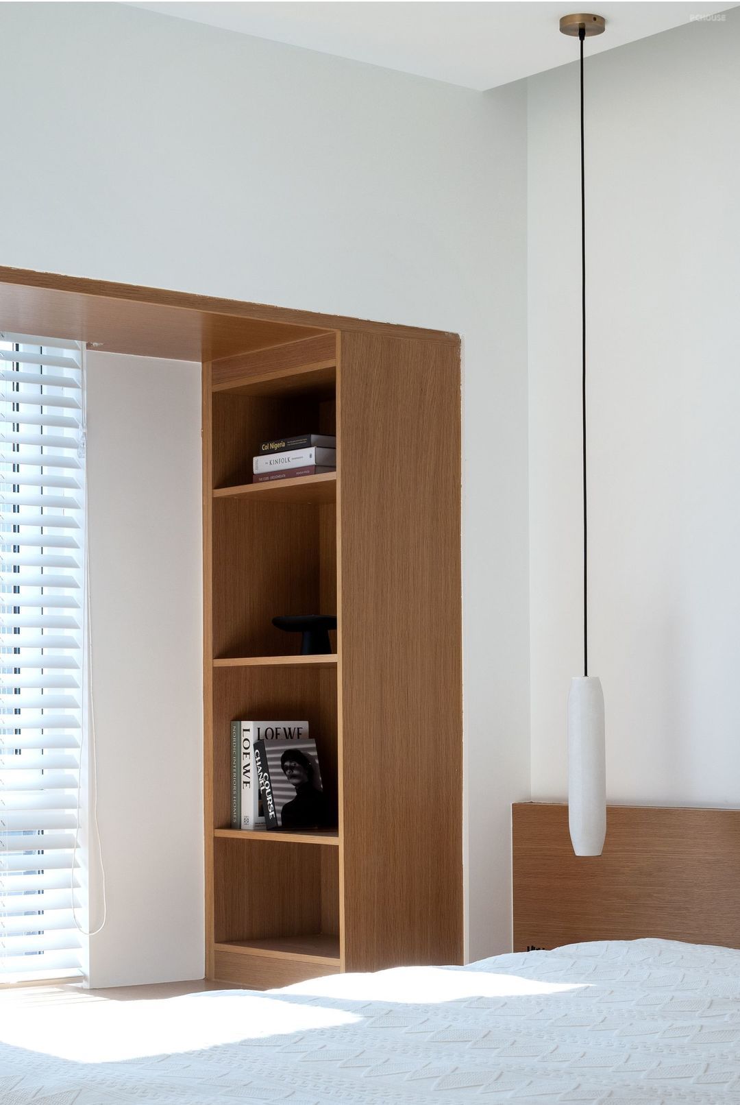 主卧设计以简为美,不事奢华,是淡雅安静的模样。延续外部空间的设计元素,大大的飘窗,干净的白色百叶帘,让光线成为整个卧室最不缺的元素,木色与白色在自然光的牵引下,呈现出柔美的氛围感。