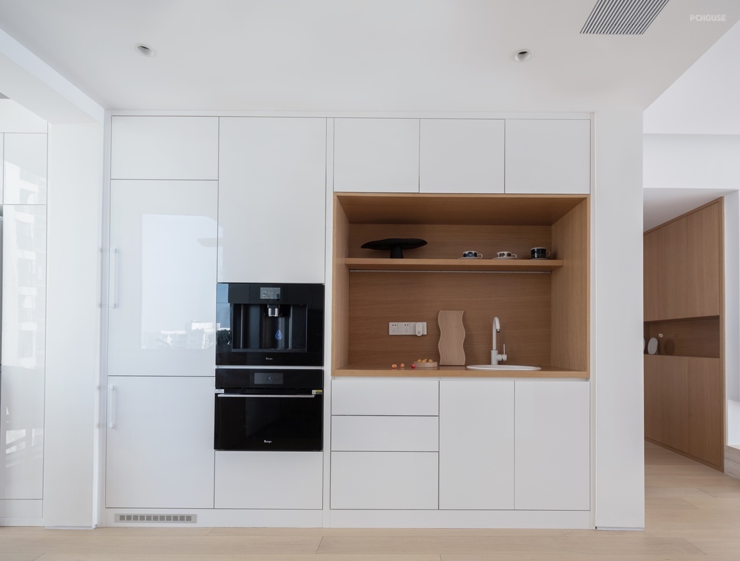 餐边柜集成了西厨和收纳空间,做了整体的橱柜和家电内嵌,先是冰箱,再是烤箱、饮水机等小家电。充足的收纳空间能把整个厨房的杂物都塞进去。日常也能保持餐厨空间的整洁。