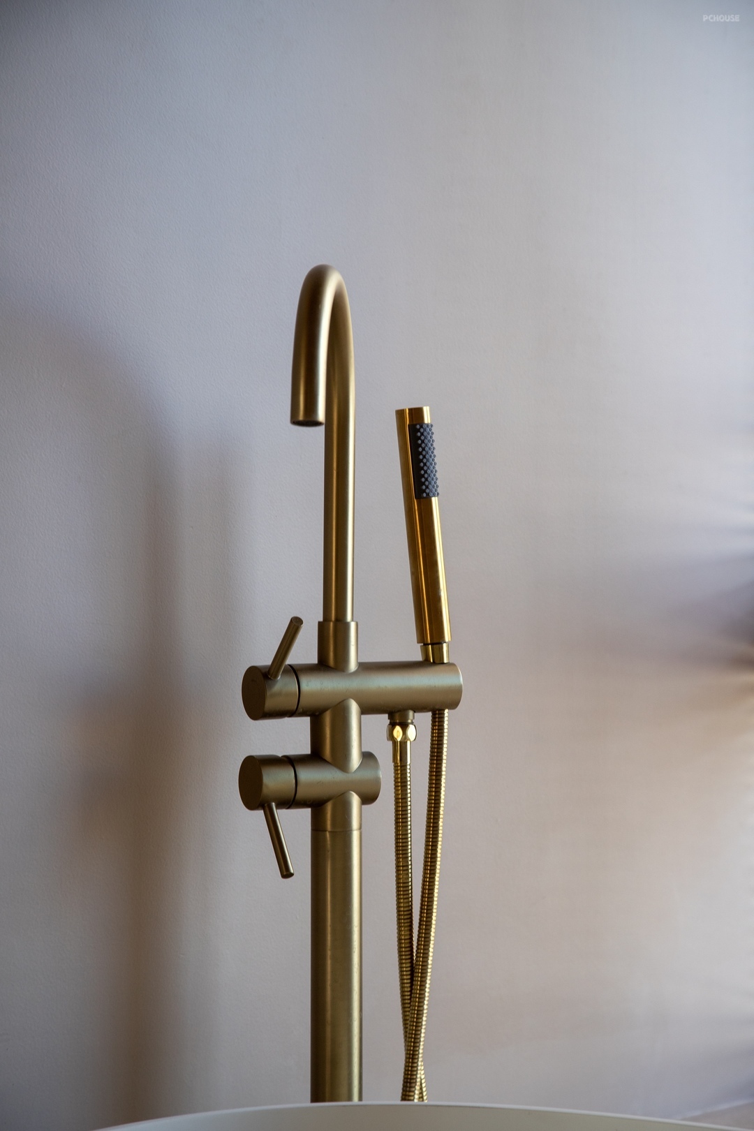 靠窗地台放置浴缸,同样安装了百叶帘解决隐私问题,光线感超好!浴缸一旁做了适宜高度的壁龛,一个美观又实用的存在,拿取洗漱用品特别方便。黄铜质感的落地龙头细节真的爱了,与整个浴室装饰相得益彰。
