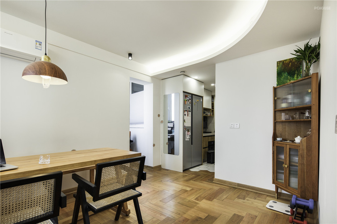 圆弧吊顶灯带,是为遮挡新风管道,不需要走管子的地方尽量做到简约,因此做半圆造型,顶部加装明装筒灯可以根据需求调节角度,随时补充客厅内亮度。餐桌后面的白墙可作为投影墙面来使用。