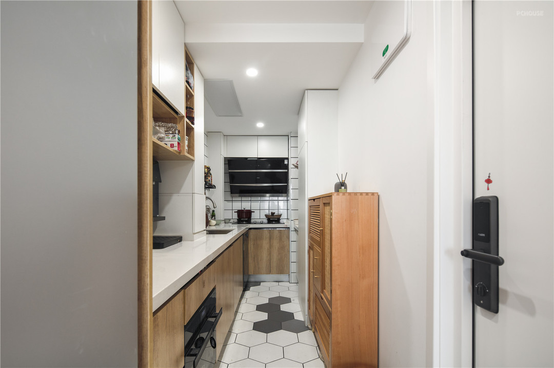 厨房开放后延长了橱柜增加了蒸烤箱和冰箱柜,吊柜可以收纳餐厨用具,台面可以摆放水果或者菜品,作为辅助备餐或西厨使用。