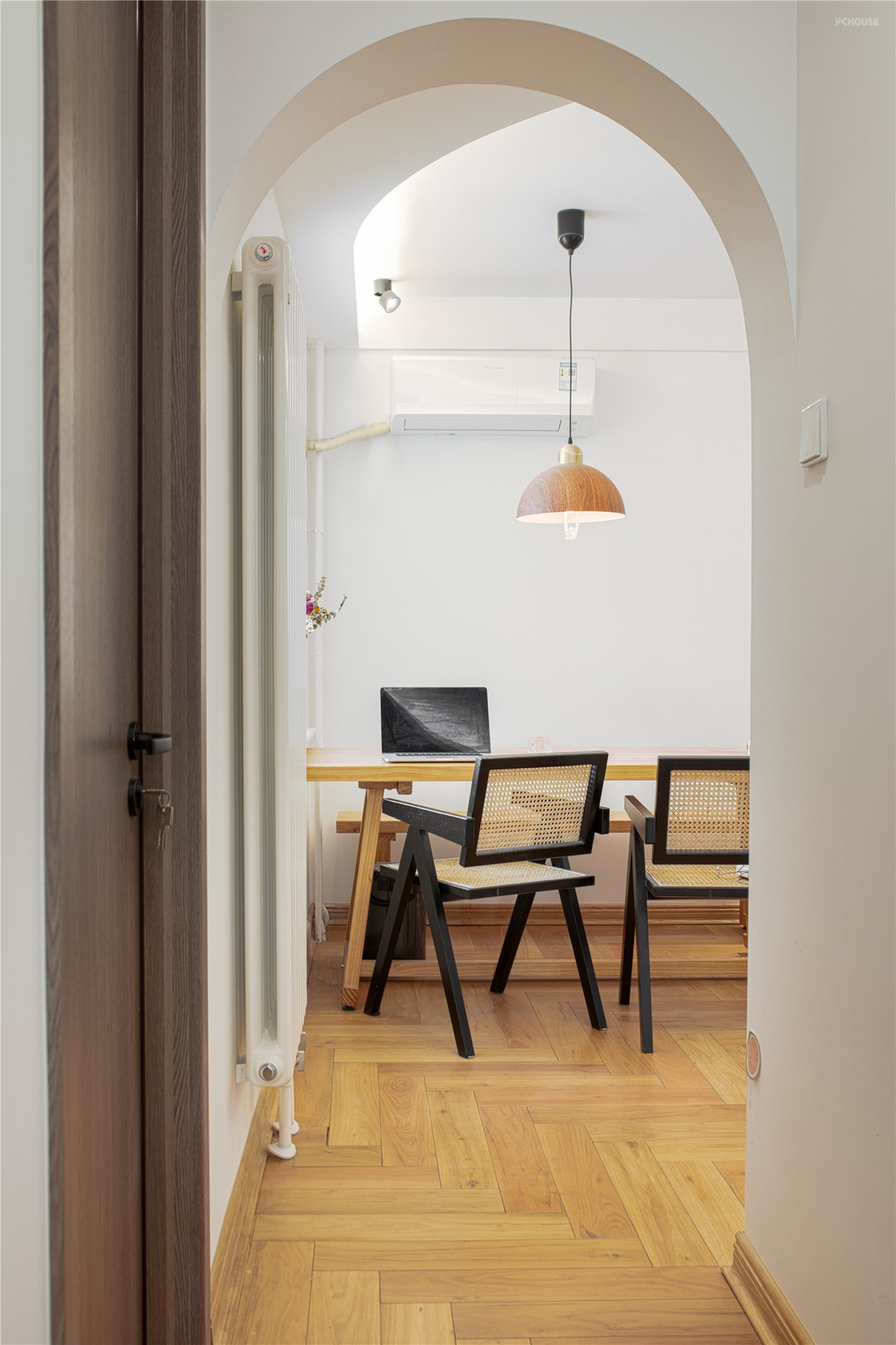 走廊做成弧形穹顶,一是要隐藏新风管道,而是走廊比较下场单调,弧线吊顶和两个垭口形成叠印效果,让空间层次更加丰富,视觉上缩短走廊长度。