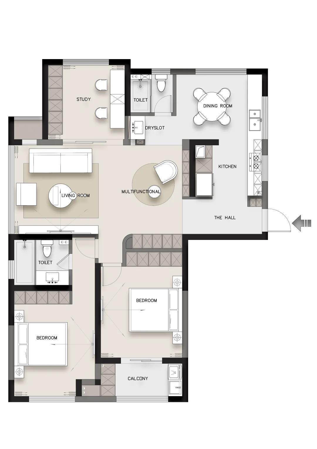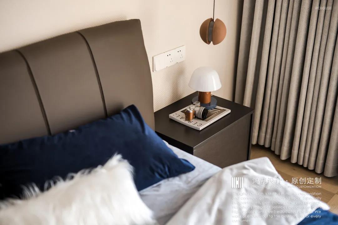 本案整体风格为现代极简风,主要以暖灰、木色为主,少量深色点缀。