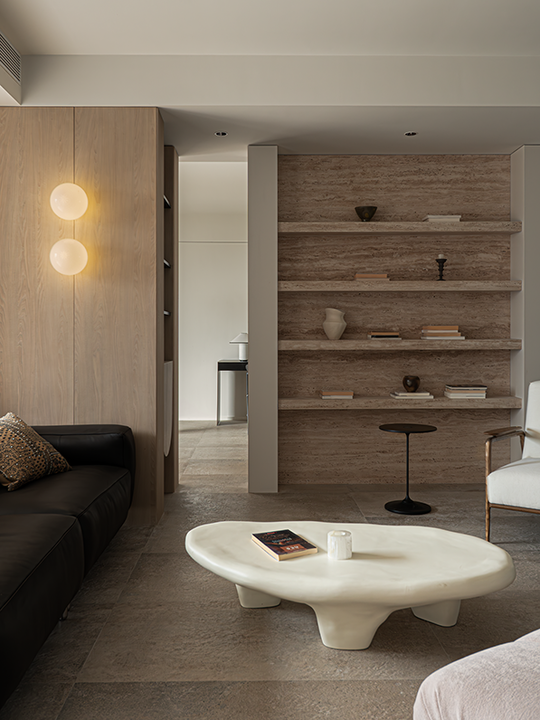 惨白的墙面过于单调,穿上草木从生的纹理外衣,便生出调性,一梯一户的建筑结构,使入户收纳在门外伫立,玄关就可自由展示自己。