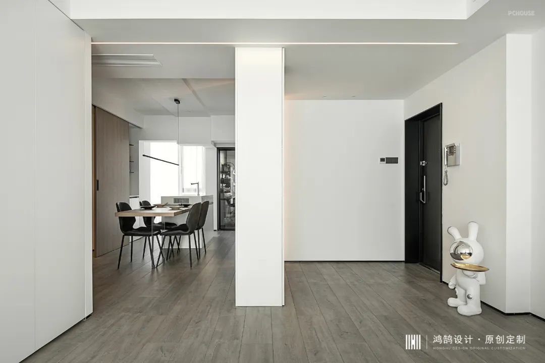 在入户正面设置一组通顶的玄关柜,柜体和墙体之间保留10公分的间距,让柜体本身不会对入户视觉上形成较大的压抑感。