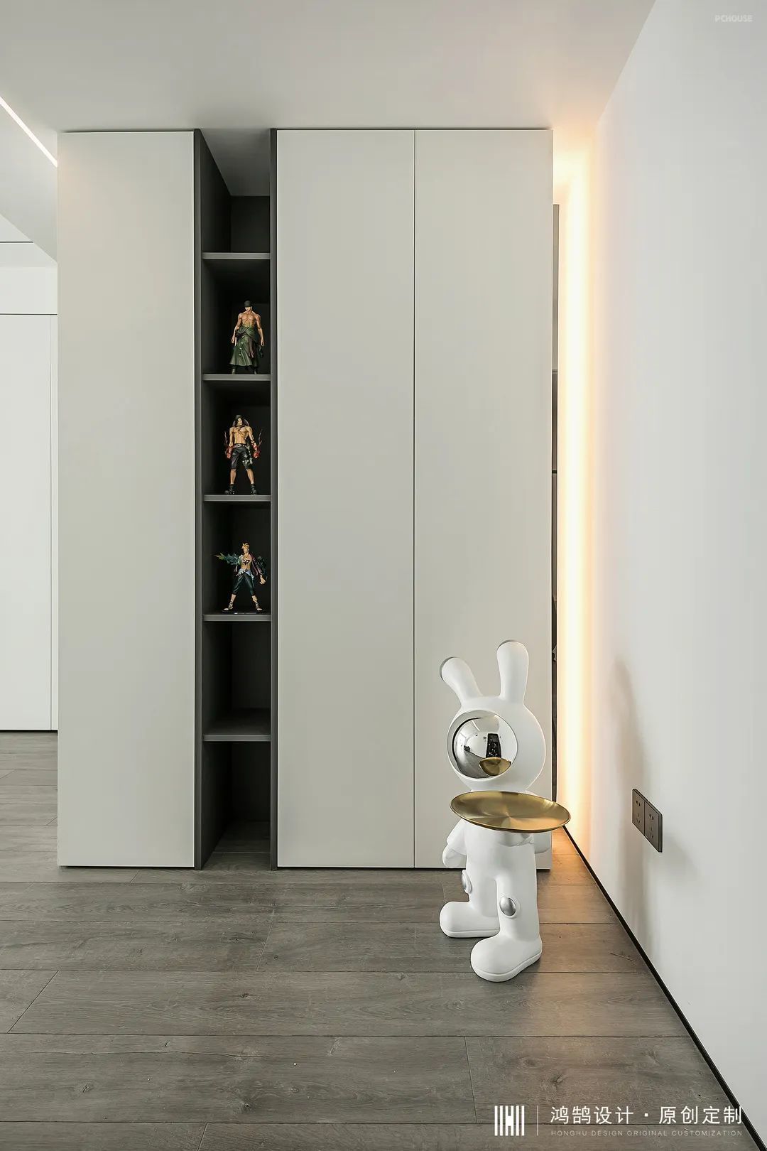 玄关柜设置了一组展示性质的开放格,来展示业主最心爱的手办,这样一进入家门就可以感到轻松愉悦。