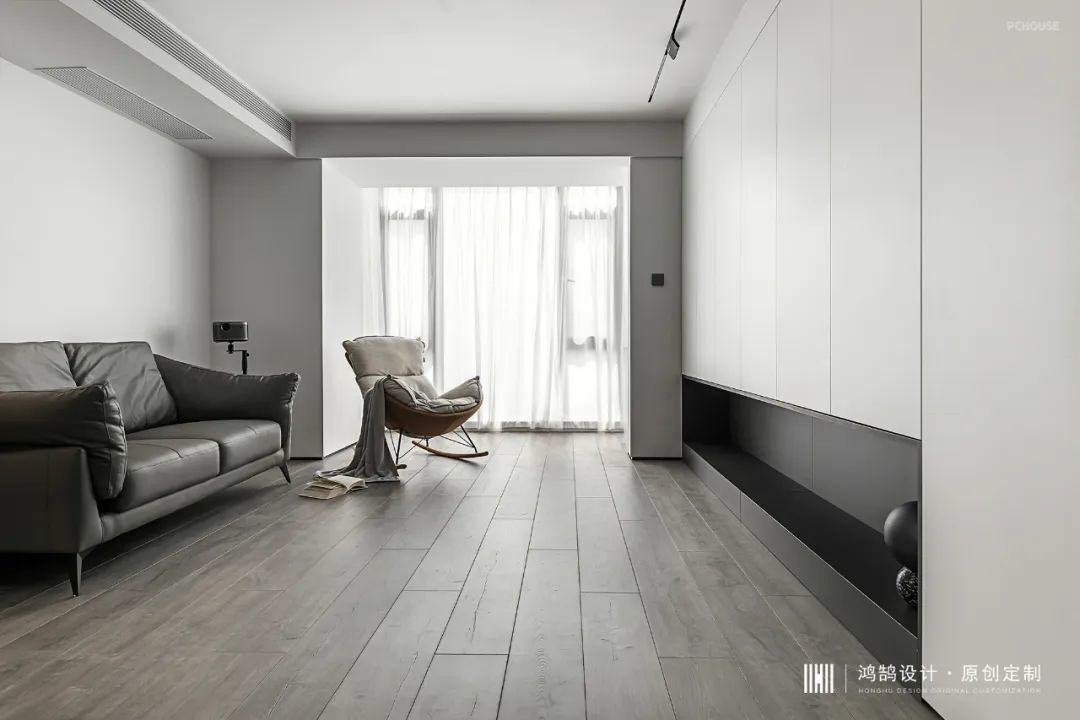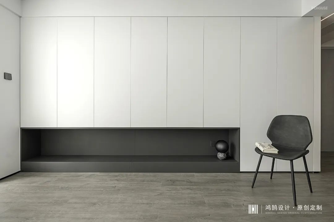 客厅舍弃了传统电视背景墙,利用原墙体,增加了一整排的收纳柜,让客厅的功能不再局限,同时大大加强了储物功能。在柜体的设计上,部分选择了腾空处理,让下方空出一排展示区域。配色方面,采用黑白撞色,让整面的收纳墙不会单调。