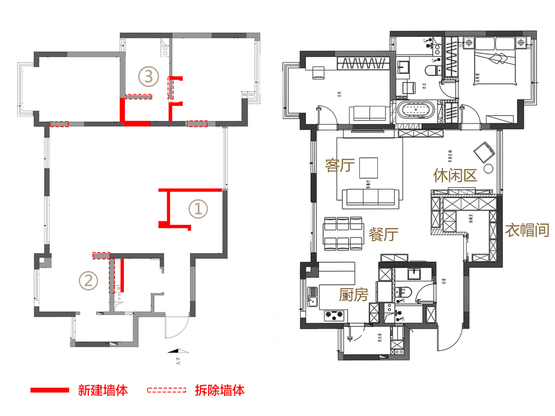 ①  原户型公区方正,南北通透,两侧采光面都非常优秀,只是南侧窗外有树枝遮挡且入户门正对客厅,因此设计在入户位置增加独立衣帽间,既满足收纳又起到区域分割作用,将客厅挪至北侧,南侧预留出阅读休闲区。