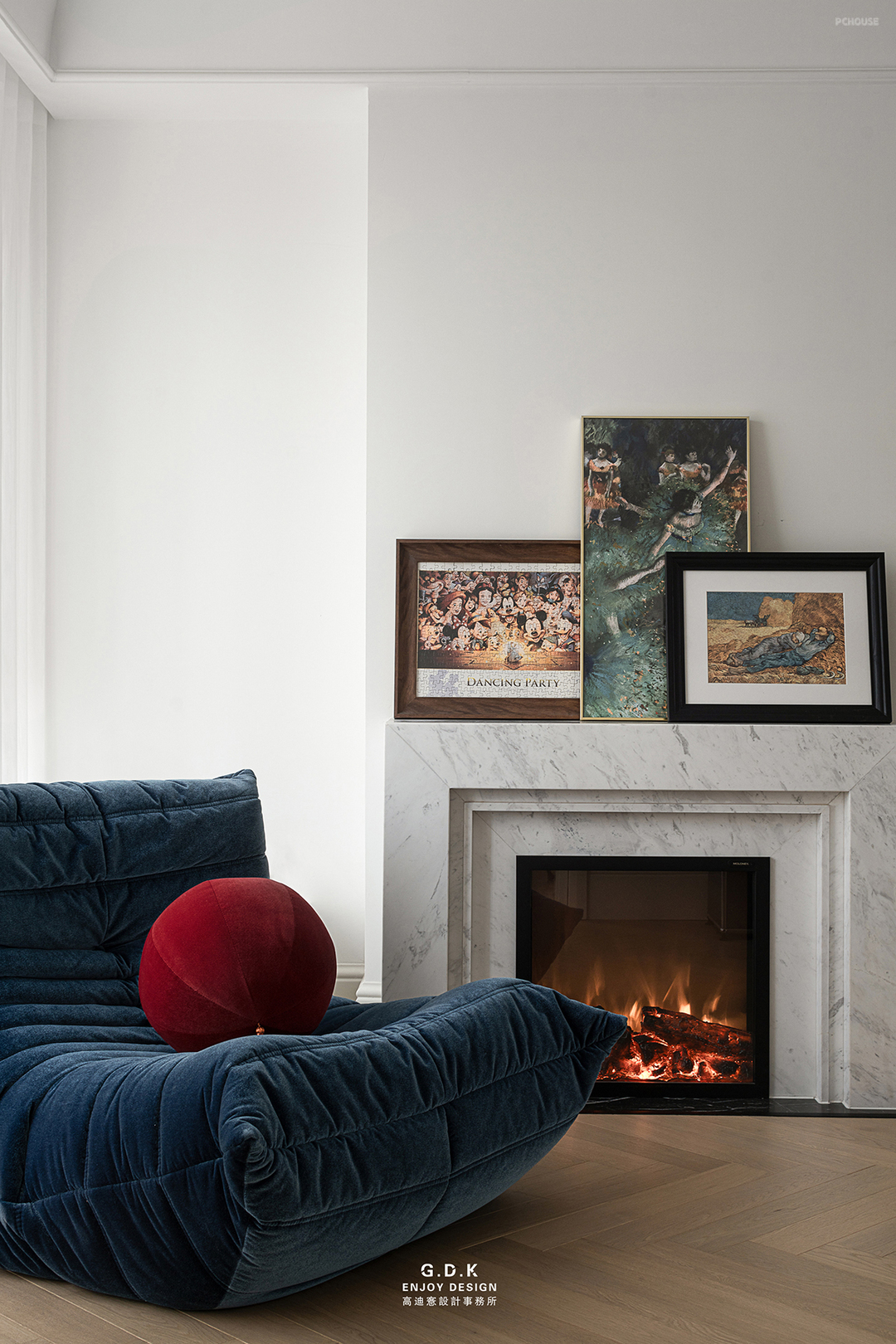 调整后的空间划分出了一个独立的阅读区,围绕着壁炉,一张好看的单人沙发,几幅精心装裱的画以及满满当当的书架,让人安心又富足,或阅读,或小憩,时光在这里变得宁静又漫长~