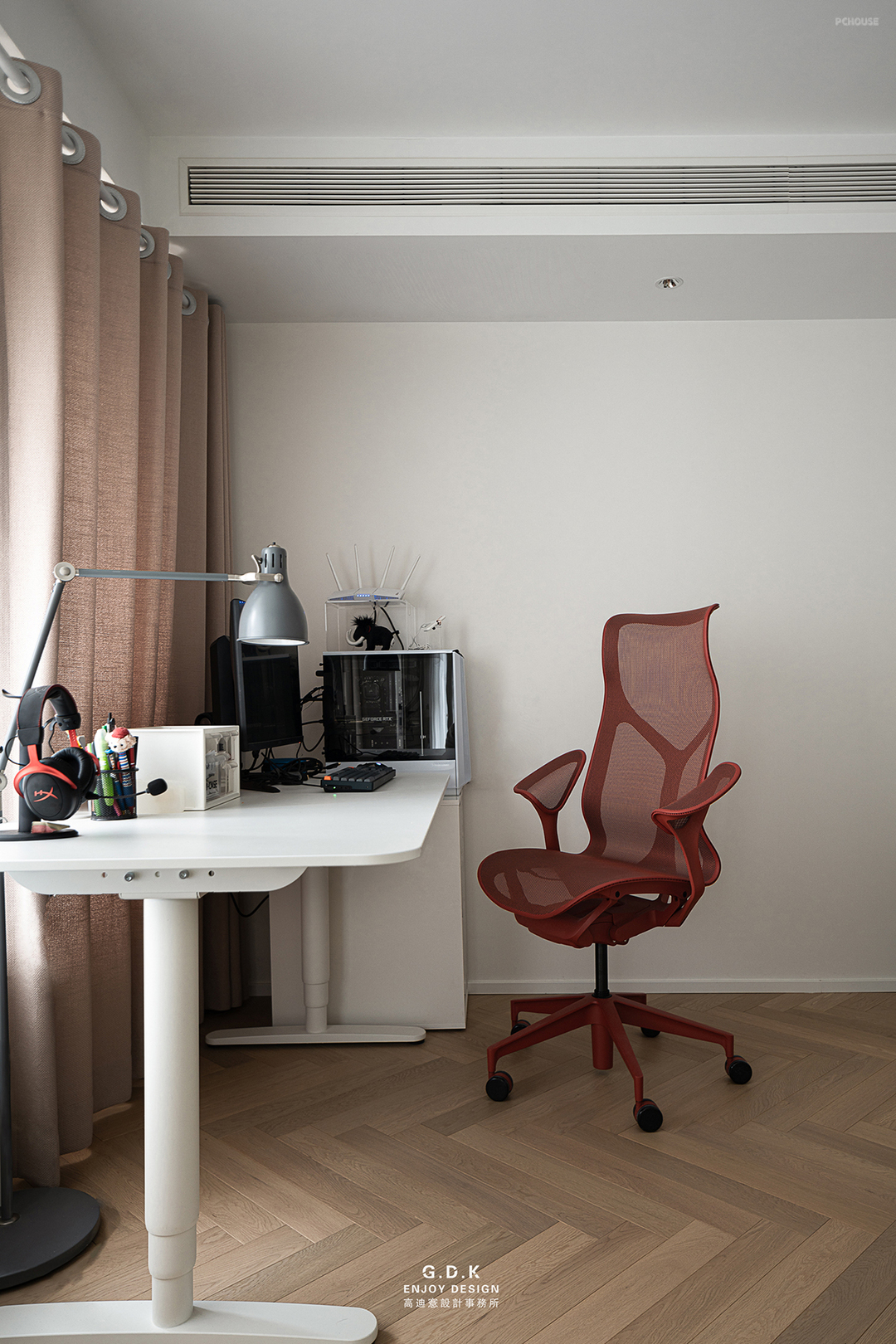 次卧目前主要作为家庭办公、游戏、客房使用,也为未来的儿童房预留了可扩展的空间,(椅子来自Herman Miller)