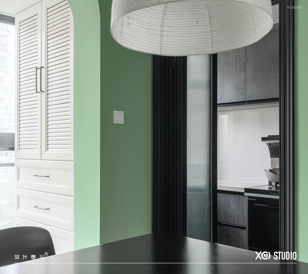 这个角度可以看到阳台柜,由于内置燃气表,两扇柜门使用的百叶透气材质,造型过关也解决了燃气表密闭问题。