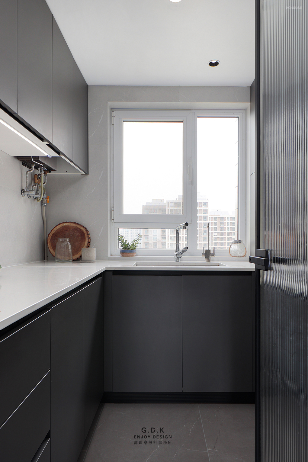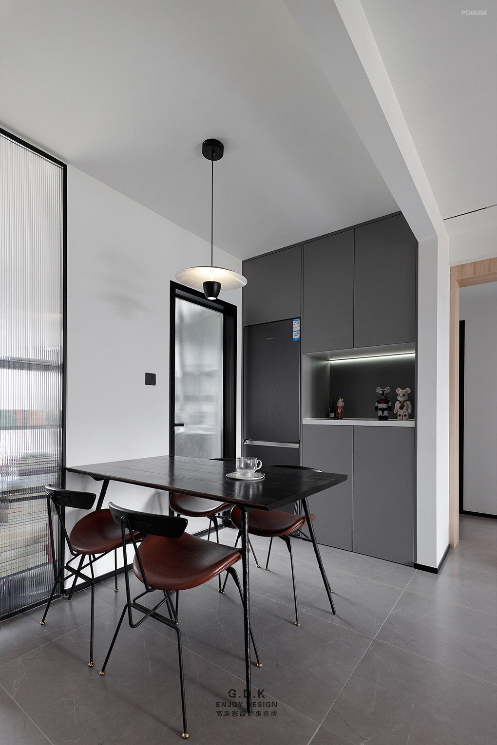 竖条纹的长虹玻璃替代了墙和门,增加了餐厅的采光,视觉上也更开阔通透。深色哑光的烤漆柜面在空间中的穿插起到了柔和的作用。