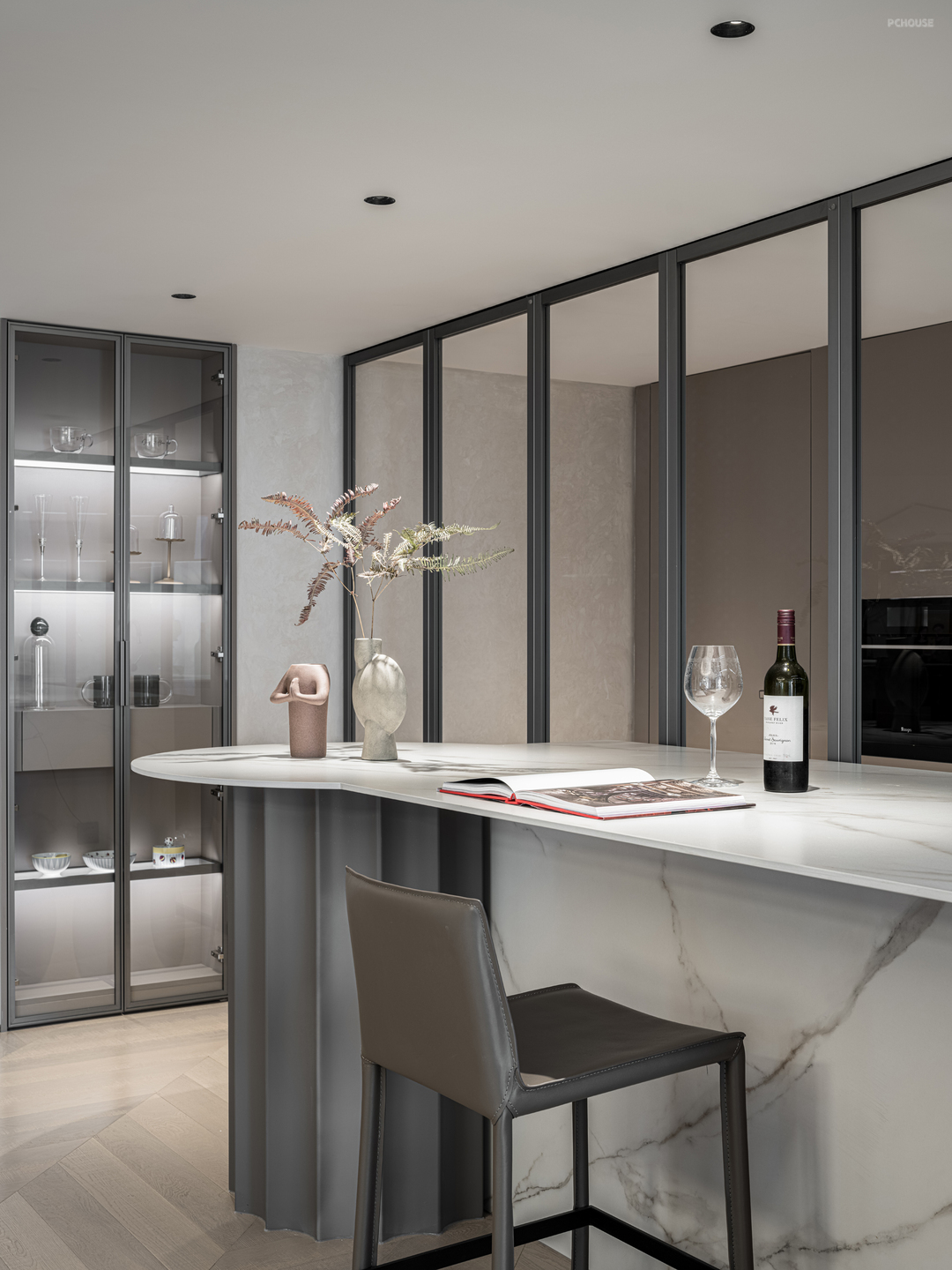岛台对侧墙体开凿,打造嵌入式展览柜,窄框玻璃门与恰到好处的射灯点缀,让收纳柜也变身艺术品。