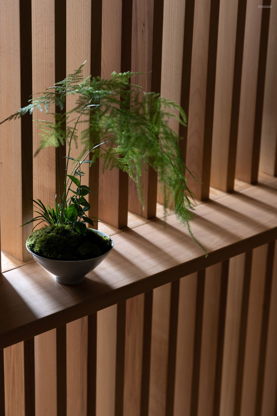 白蜡木边几与黑胡桃木茶几,甚至是白橡木地板,从人类最原始的居住出发,与自然毗邻,客厅区5种不同木材的搭配,似乎透露出些许“京都安缦”的意韵。