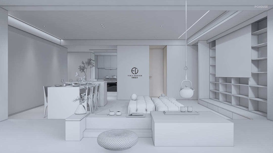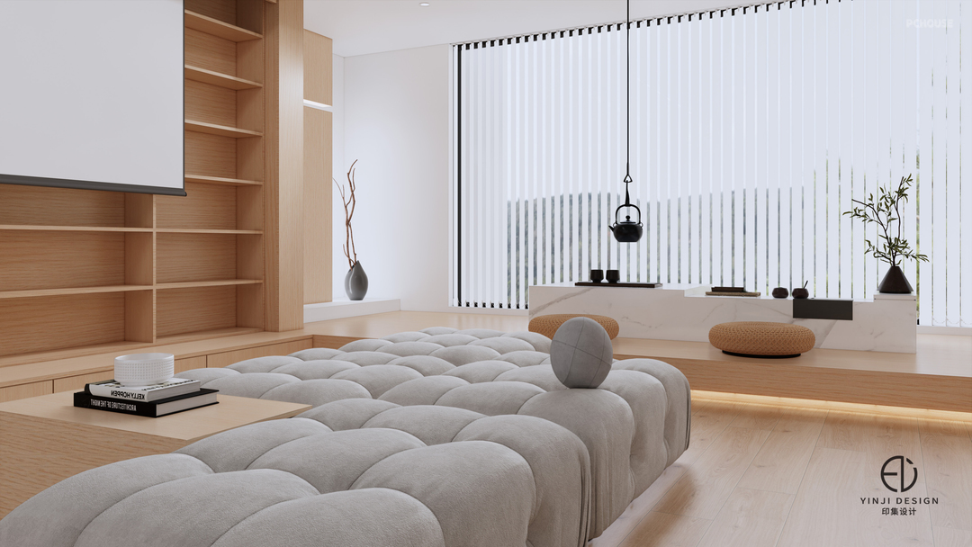 开放式储物格容纳更多收藏爱好;顶上隐藏投影幕布跟随喜好;四向坐沙发让空间变得很活跃。