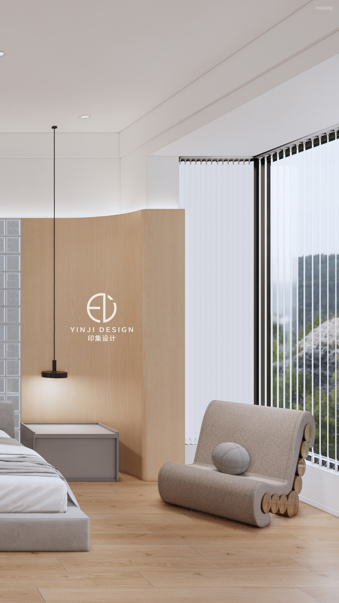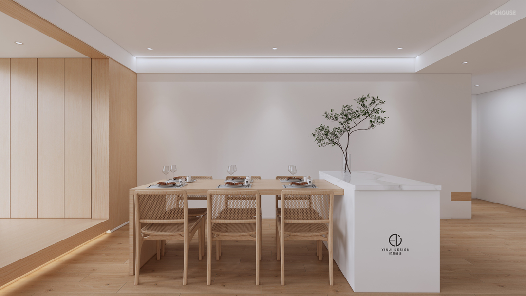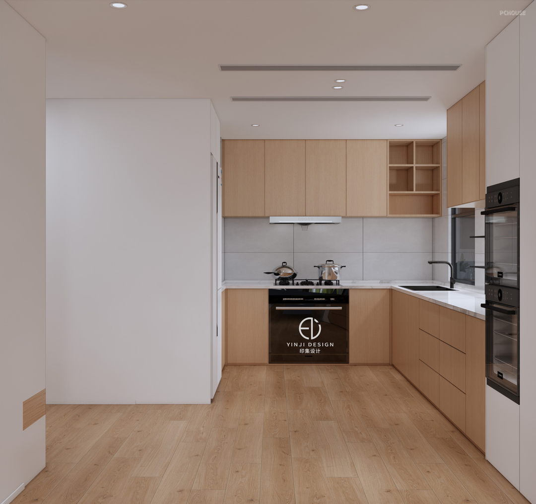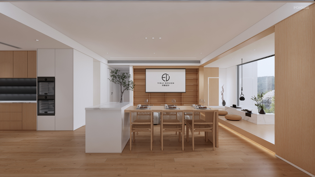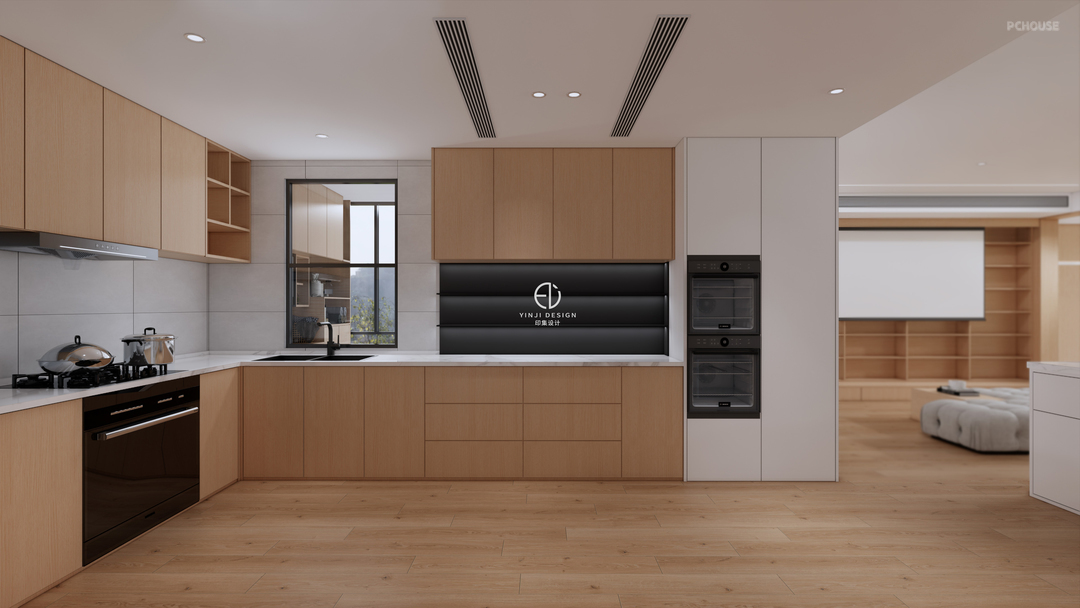 横厅设计空间尺度更宽阔,采光及视野更通透。原木材质地板及柜体、台面质感统一且干净温柔。