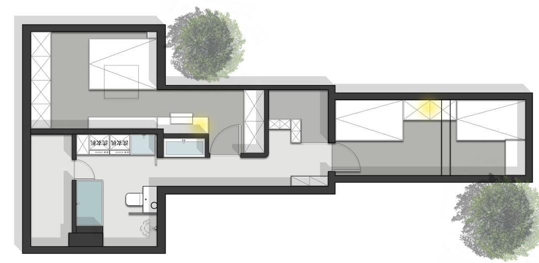 3、二层衣帽间和二层卫生间进行了整体改造,主卧进门的空间与小衣柜相结合,将主卧的空间释放出来。卫生间因受屋顶斜面影响 ,在最里面的位置隔出了一个储物间,平时可以放置一些生活用品。在最低的位置放置了浴缸,在最高位置放置马桶与淋浴。