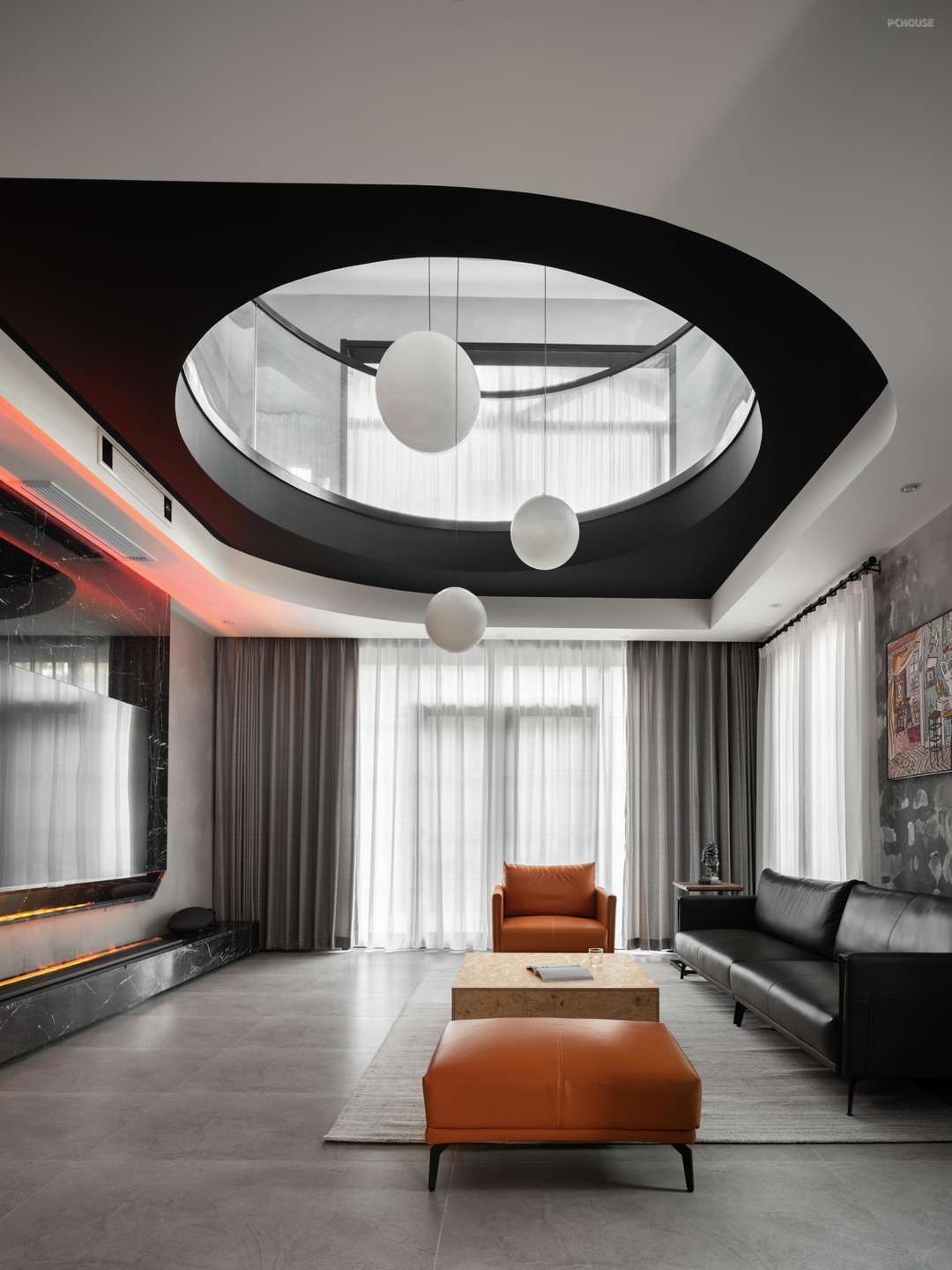 在建筑原有的基础上,形成挑空结构,打通一层二层。同时,自然光也可以从圆形挑空区贯穿而下,让整个客厅更为通透、明亮。