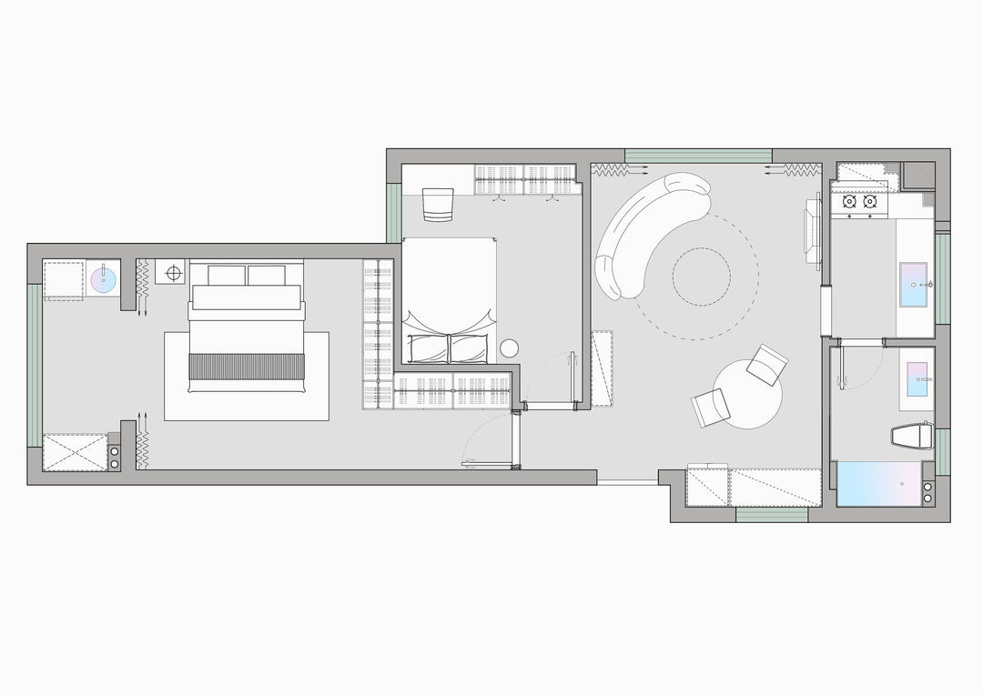 本项目建筑面积86平,房型总体上呈“一”字分布,主卧、次卧、客厅依次排开,厨房和卫生间集中在一侧,空间被生硬地划分成数个功能区,不能达到使用的最优解。