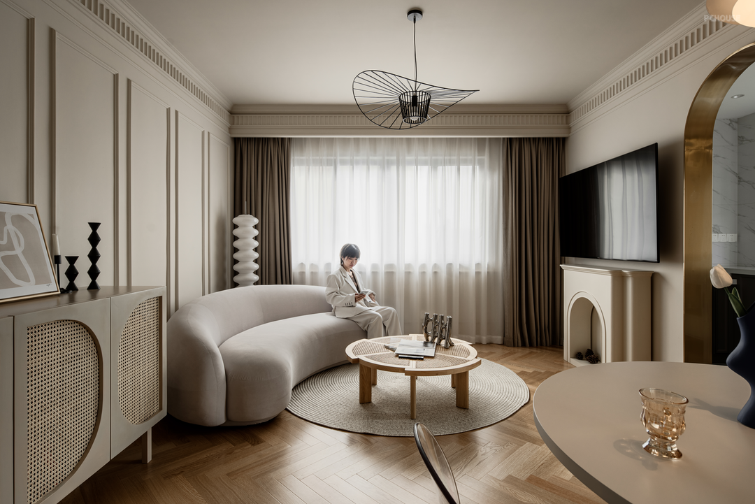 客厅面积不大,还要在一角放下餐桌,我们采用佐敦1519香草拿铁乳胶漆,搭配做工精细的墙面装饰线条,还有木纹细腻的人字拼地板,从硬装上给空间一个清透雅致的基调。同时搭配时尚灯具和充满设计感的摆件, 为客厅带来一些趣味。