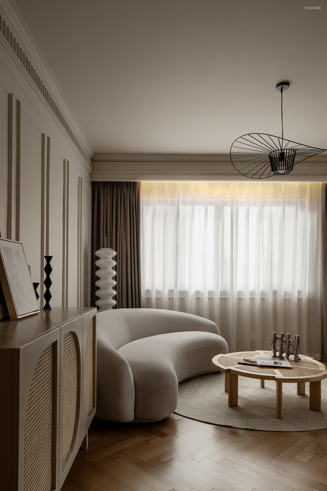 弧形沙发占据一角,没有普通沙发的笨重感。在沙发背后的墙角空隙放置一串白色糖葫芦落地灯,填补空间死角。落地灯搭配窗帘上方的氛围光,暖黄的光芒给浅色空间带来温暖的感觉。