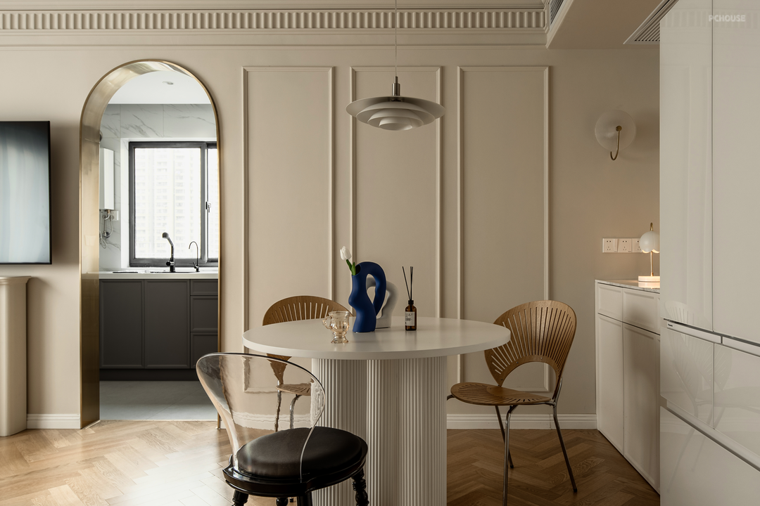 浴室入口移进厨房,餐厅空间只用一个拱形门洞与厨房相连,提升客餐厅空间整体度,让空间稳定下来。作为背景的整块墙面同样设置石膏线装饰,让同一个空间内的两个功能区和谐统一起来。