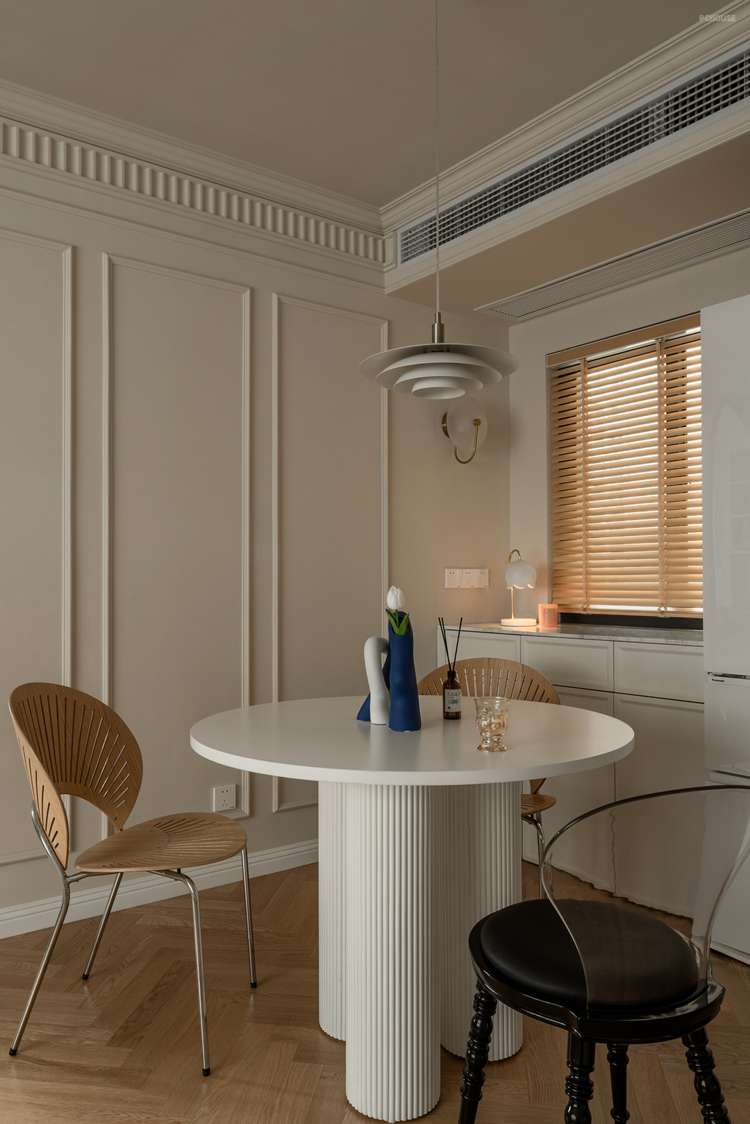 木制百叶保留自然光线,隔离杂乱的过道景象,搭配小壁灯,制造餐桌旁的光影一角。
