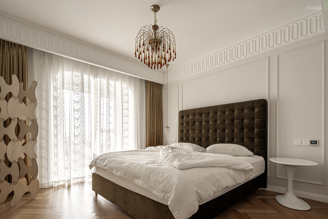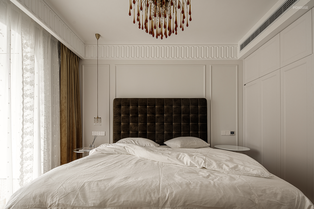 两把不一样的小边几承担起床头柜的功能,搭配床头吊灯,营造出法式的精致感。