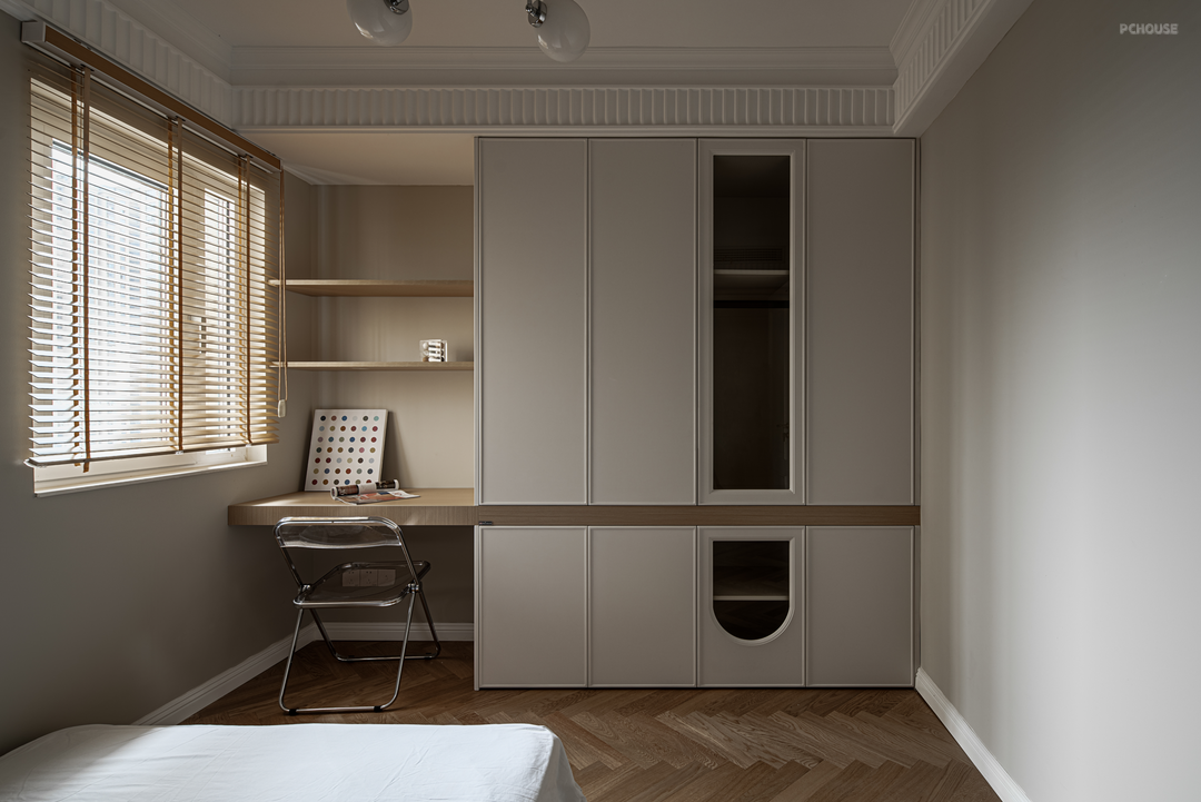 为了增加主卧储物空间,我们移动次卧墙壁和卧室门位置,给一组顶天立地转角柜腾出了空间。柜子表面类似墙体,颜色统一更显开阔,不会让空间压抑。