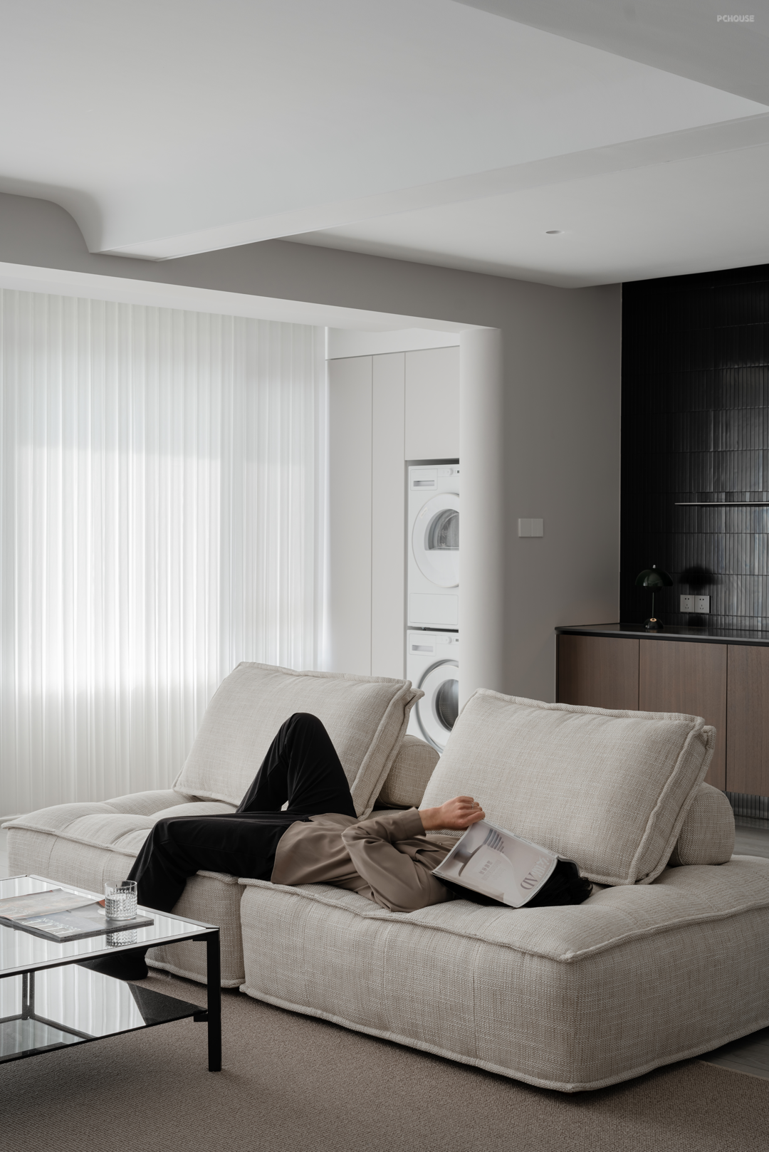 客厅被分成两个区域:以黑色和木色为主的展示区,水吧区。以白色和灰色为主的休闲区。