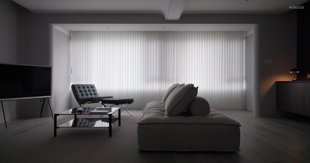 阳台内包,调整柔光帘的角度,可让阳光斜斜进入,随着太阳的移动如时针划过室内, 也可完全关闭,过滤掉刺目的光线,漫了满眼的清透柔光。