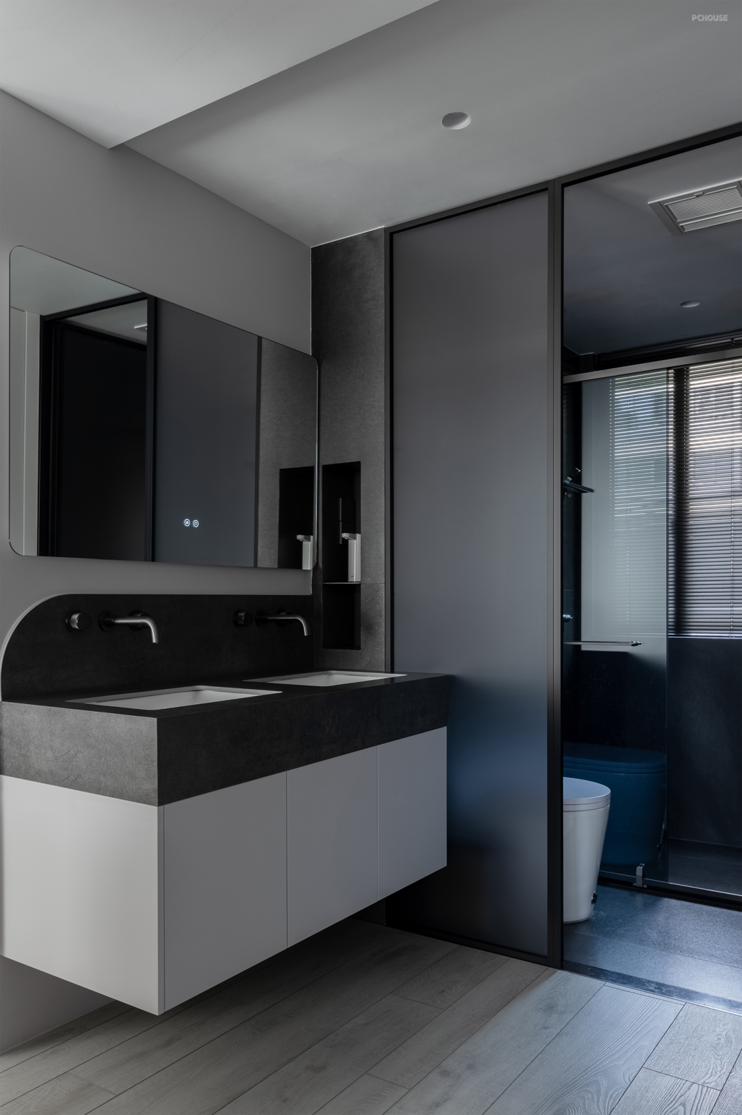 卫生间依旧是黑白分明的搭配,白色大容量柜体稳稳托住黑色岩板洗漱台,双台盆是屋主的要求。从镜子到台面,花样很少,却是尽显精致的细节处理:镜子的圆角与台面的圆角,两个枪灰色水龙头,高度不一的壁龛。
