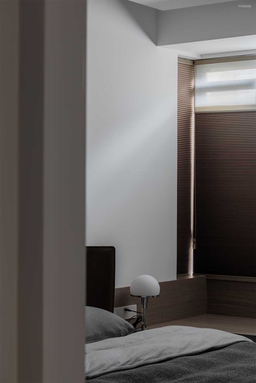 屋主偏爱灰色,从床品可见一斑。卧室偏温暖放松,日夜帘对光的控制更加精细,可以将卧室维持在舒适的光感中。
