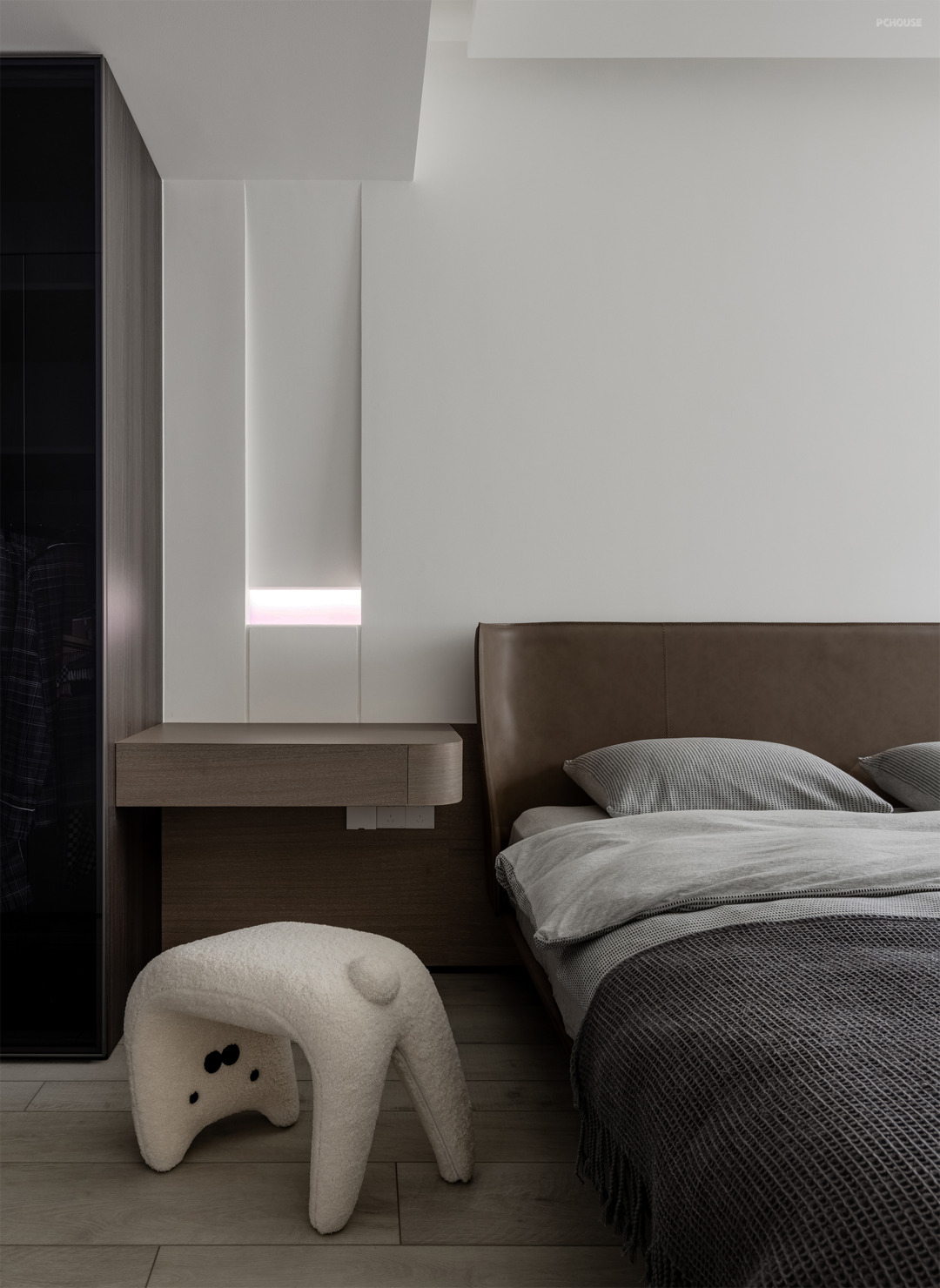 主卧依旧是石晶地板,但墙体换成纯白,同时引入更多暖色:棕色ALYS真皮床、瑞士檀木木饰面,褐色纸质蜂巢帘。