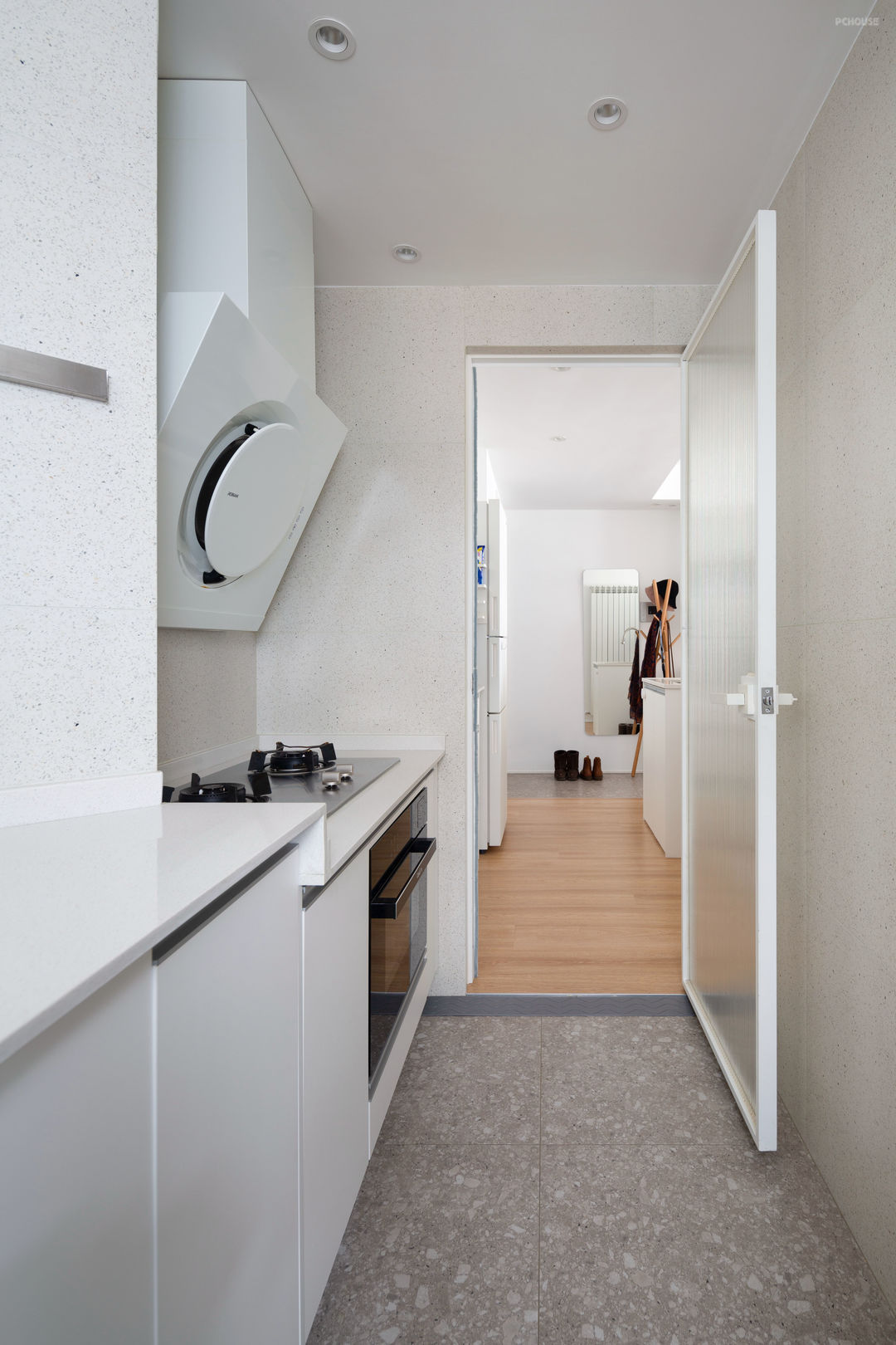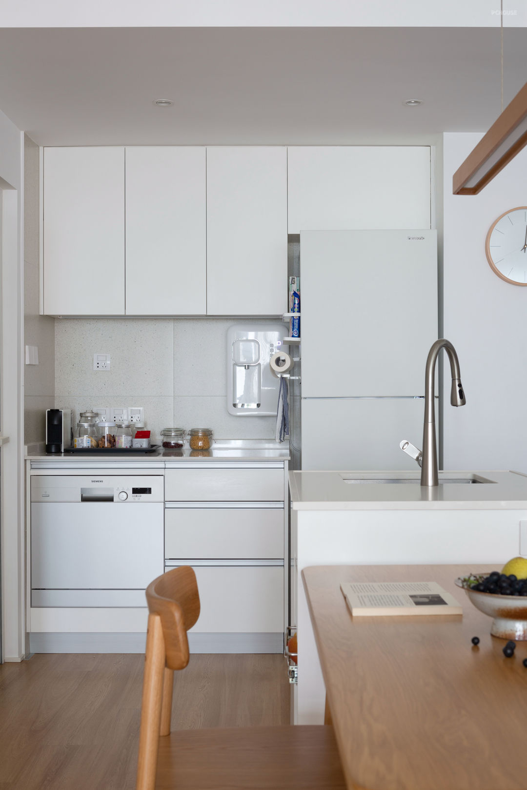 备菜、烹饪在内厨进行,冰箱、咖啡饮品、煲饭、饮水、餐具水果清洗的功能则转移到外厨及餐厅处,抵消厨房空间不足带来的不便。