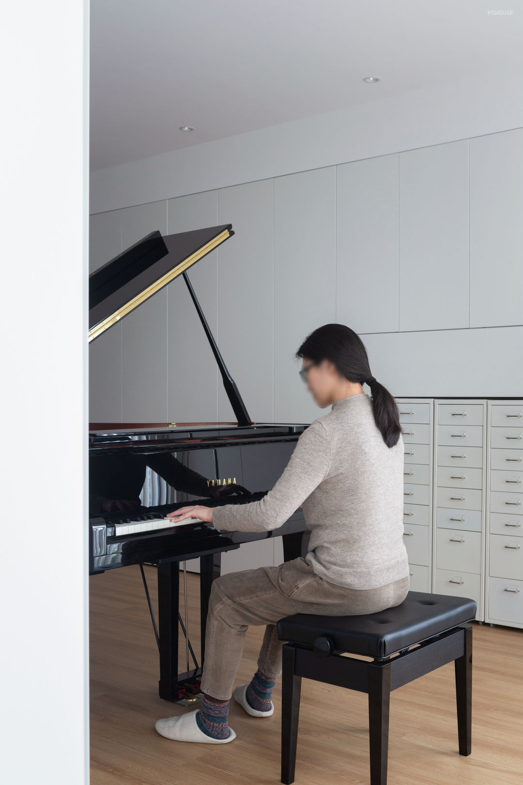 琴房、阳台和起居室形成一条洄游动线,屋主笑谈:“朋友家的孩子来了,会兴冲冲地围着跑圈圈,还在那数家里到底有几个圈。”