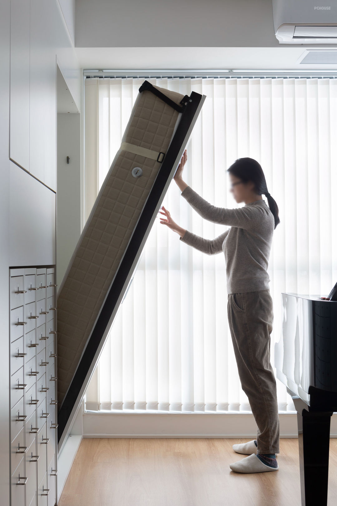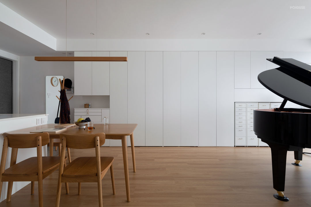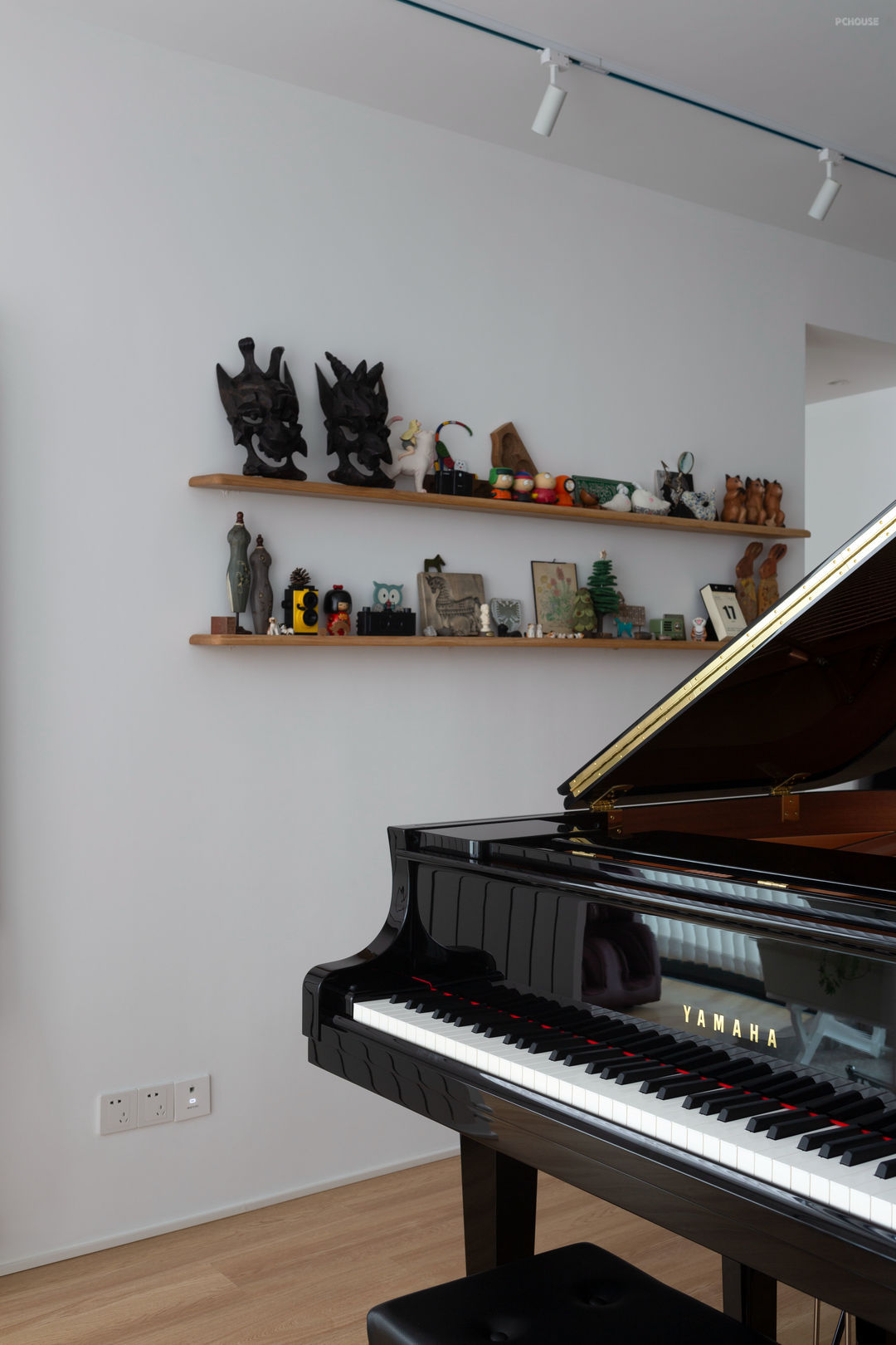 钢琴的位置是经过仔细考虑的,四周留有宽敞的过道,方便通行和朋友聚会。有朋友留宿时,放下墨菲床即可,不受阻碍。