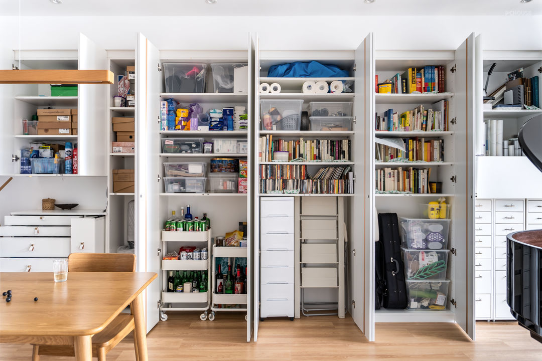 屋主的物品不多,但除主卧衣柜外,物品都集中在客厅的收纳柜,因此本案做了精细的收纳分类,层高、宽度等都经过精密的计算。