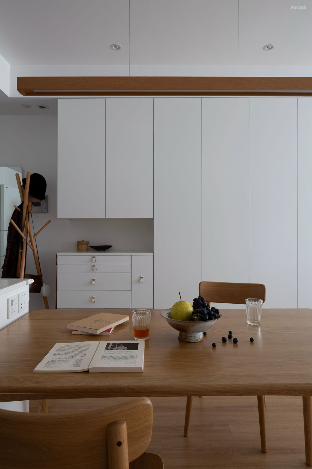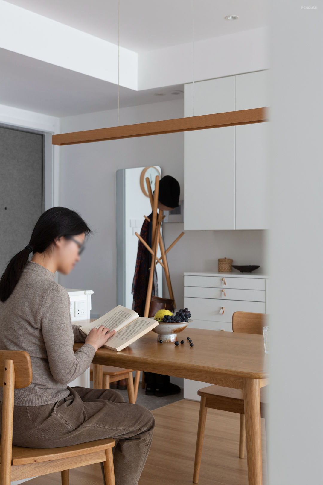 岛台旁放置一条长凳,既可作为换鞋凳,避免灰尘进入餐厨区;同时也是餐椅,会餐时使用。