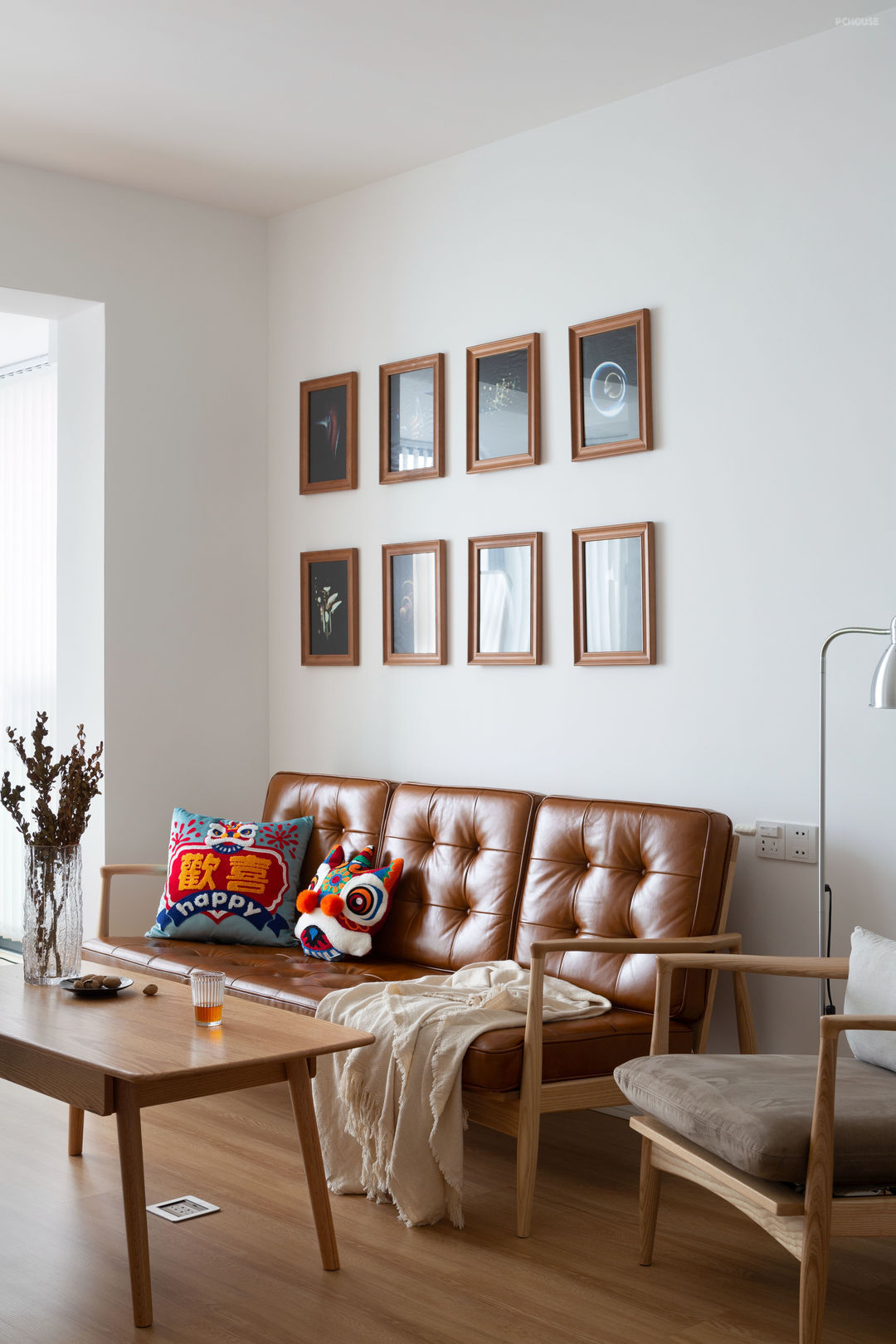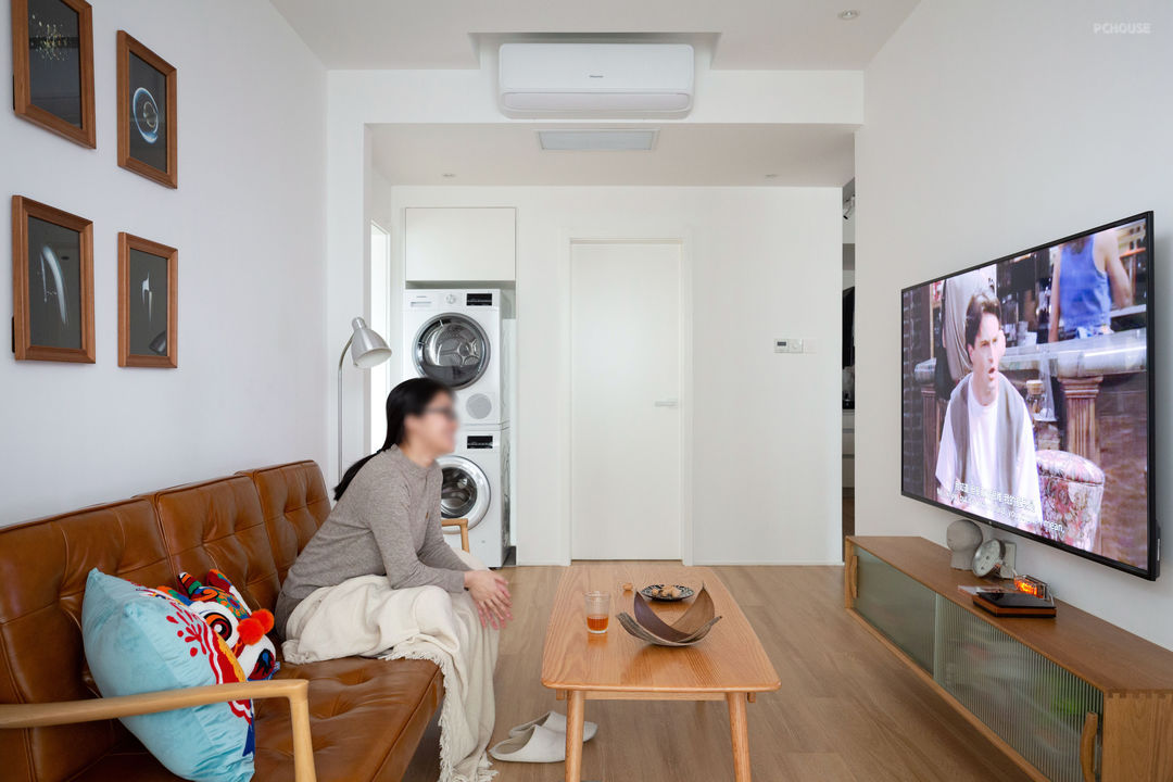 中午的时候,屋主习惯躺沙发上休息一会儿,抱枕垫在头后,再搭一面薄毯,慢慢入睡。一字皮质沙发+茶几+电视组成起居室,小小的空间看电视、吃零食十分舒服。