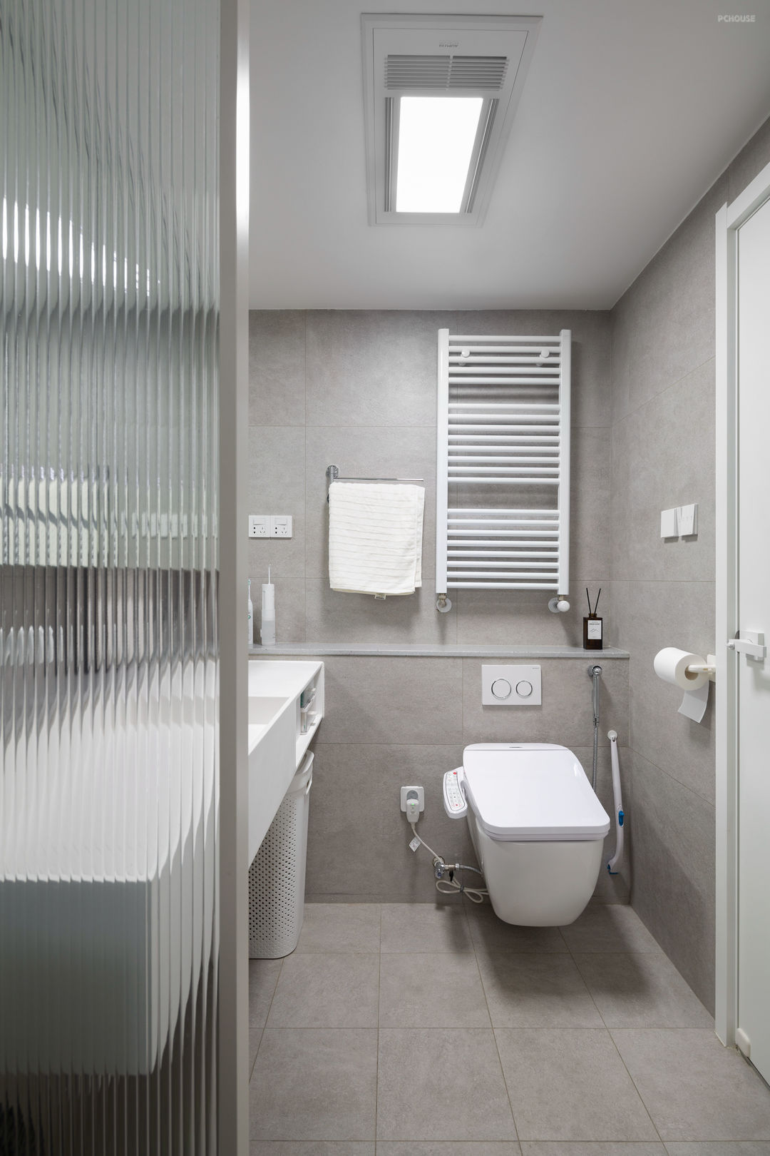 为了隐藏马桶水箱,在马桶后面新建半墙,顺势延伸到洗手台后面,造型独特,同时台面可以放置一些常用的物品或饰品。大面镜子从视觉上扩大空间,柔和的镜前灯探下来,照亮脸部轮廓、不留阴影。
