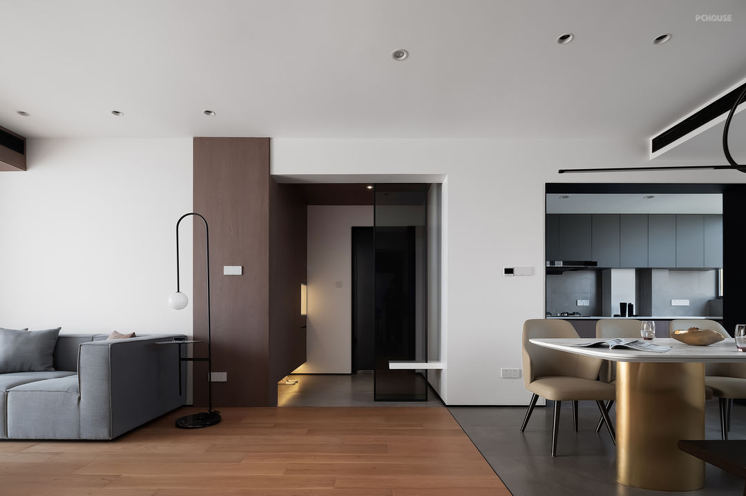2. 拆除玄关与客厅之间的部分隔墙,从而将南面的光线引入到玄关处,我们在正对入户门的的位置竖立了一个玻璃屏风,强化玄关与客餐厅的界限感的同时让玄关更具备仪式感。