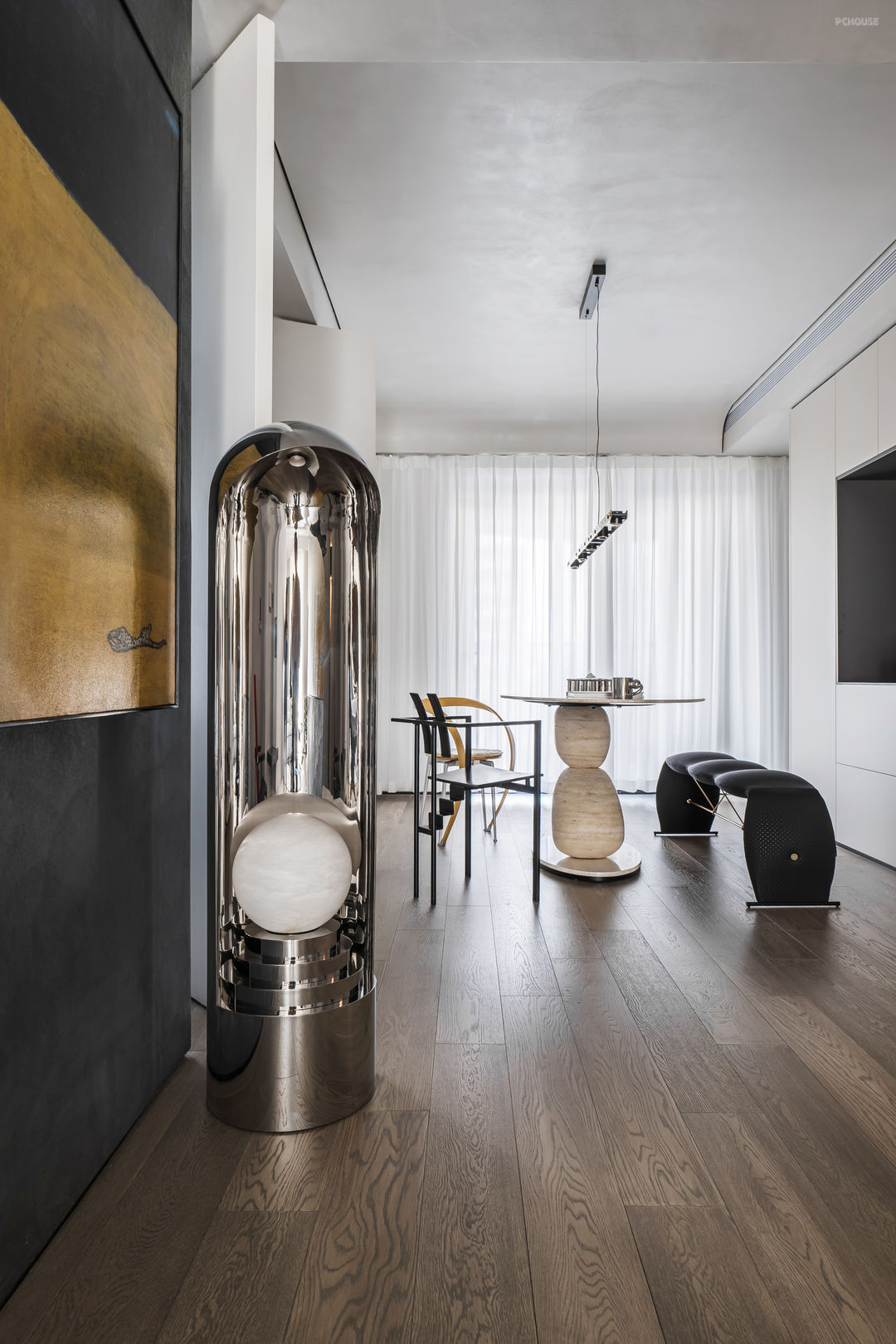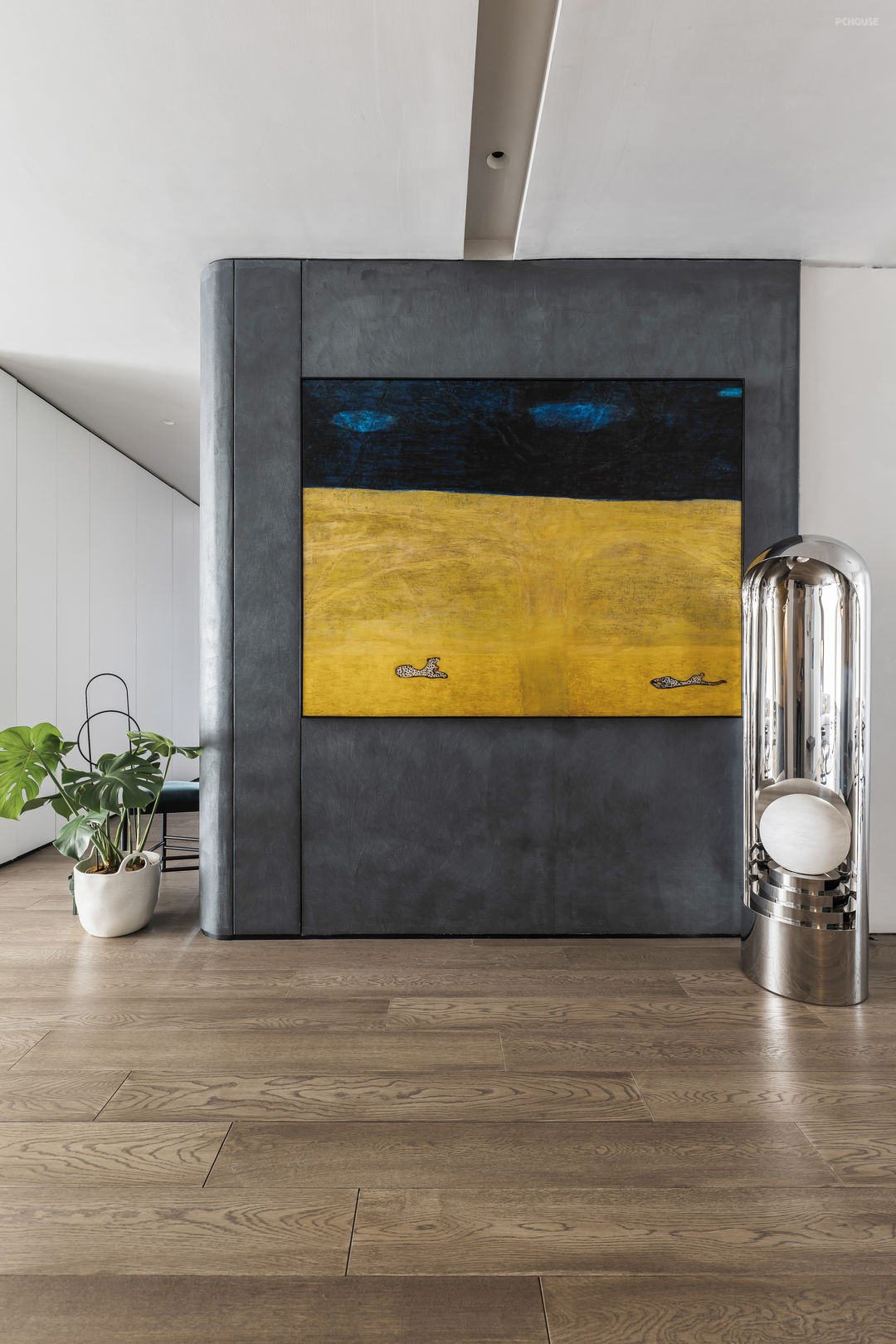 玄关画直接抓人眼球,一进门就是一种视觉冲击,常玉的画大多表现苍茫大地,渺无人烟的苍凉情境,能给人一种安静的感觉。这幅常玉的《双豹》是微喷的版画,被收录在台湾历史博物馆。精神之所的落地灯,弧形镜面不锈钢特有的幻视感与未来主义,光、玻璃和金属相互反射作用下碰撞出的音调,安静而躁动。背景墙用竖线作分割,画作恰好对准线,整齐又舒适。