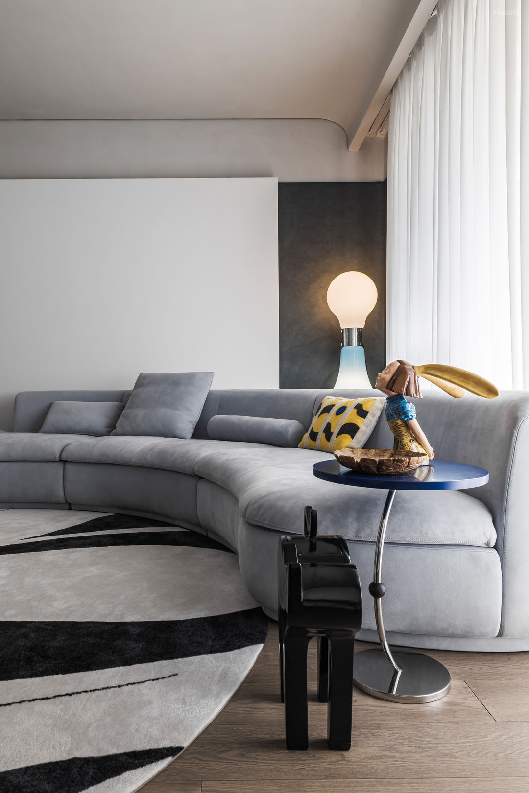 时下流行的向京艺术家系列里的作品以及地上猫形装饰品都为整个客厅增添了活力,打造出独特的艺术氛围。兔子长长的耳朵,轻轻上扬的嘴角,微微合上的双眼和稍微前倾的身体,只要怀着一颗纯洁诚挚的心去感受世界,哪怕是一抹阳光,都能让你幸福洋溢。弧形立杆完美的配合了沙发的弧度,浑然天成,和谐及平衡。