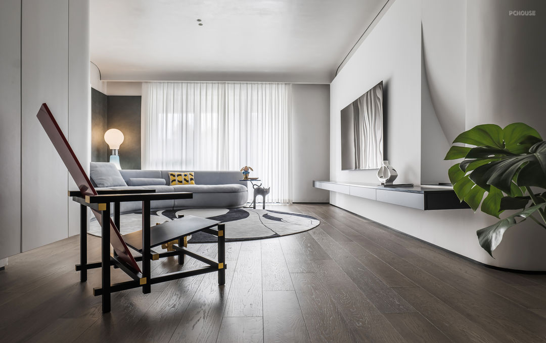 从小到大的单件物品组合在一起,奠定了整个客厅的基调。设计款灯泡灯是由 Carlo Nason 设计,由意大利 AV Mazzega 制造,由两个灯泡形的 Murano 吹制玻璃组成,并在中间由一个镀铬圆柱体连接,通过扭转系统将其固定。通过切换到三个照明位置之一,可以分别点亮两个部分。虽然置于角落,但是完全不掩盖它自身的设计感,光与背景黑色形成鲜明对比,更加敞亮。一款意式麂皮 Baxter 的异形转角沙发,在客厅里站稳脚跟,删繁就简,却暗藏着精准的美学比例,留下不动声色的简约之美。单人红蓝椅是一把中古家具,别看它好像坐起来很不舒服的样子,其实是根据人体工程学设计的,坐上去非常贴合人本身,舒适感很强。这把椅子是一个具有纯粹理想主义的雕塑座椅,它成为了一个真正的新塑形主义宣言,结合色彩的和谐对等和直角的设计,根据建筑构件的功能将其分离出来,因此它的底座是黑色的,座椅是彩色的。