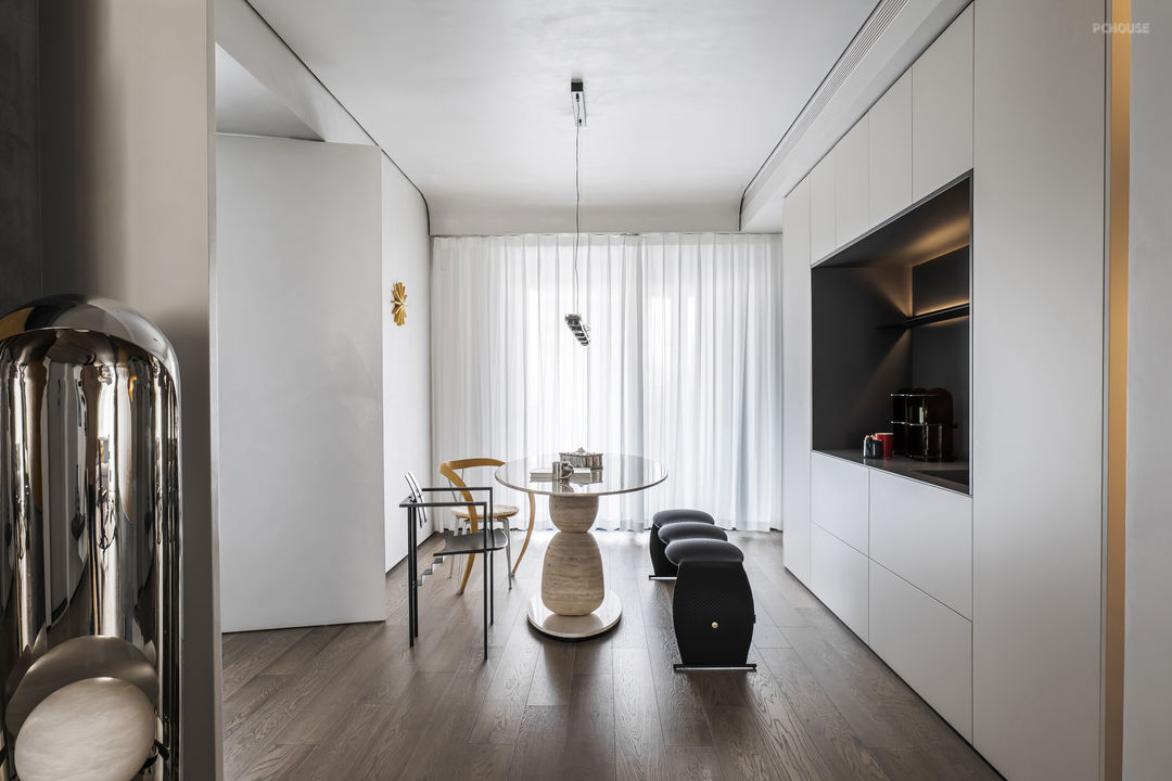 黑色餐椅是 Kral Friedrich Forster 的设计,利用几何线性,简约的勾勒出形状,靠背与座椅都是紧贴人体构造,坐感舒适。餐桌另一侧的是一把吱音偶遇长凳,这款凳子的设计灵感来源于藕节,外形似藕,节节相连,利用高弹棉包裹在五金架外,打造出坐感丰富且坚固耐用的偶遇系列。黄铜直条灯是 SEED 的,是台湾设计师把来自生活的灵感化作以简约为性格、实用与恒久性为目的的灯光美学,以简约的造型让人产生互动从而带来趣味以及幸福感。餐桌玻璃台面也给空间做了减法,底座则以白洞石为造型,梦幻联动,轻盈起居。